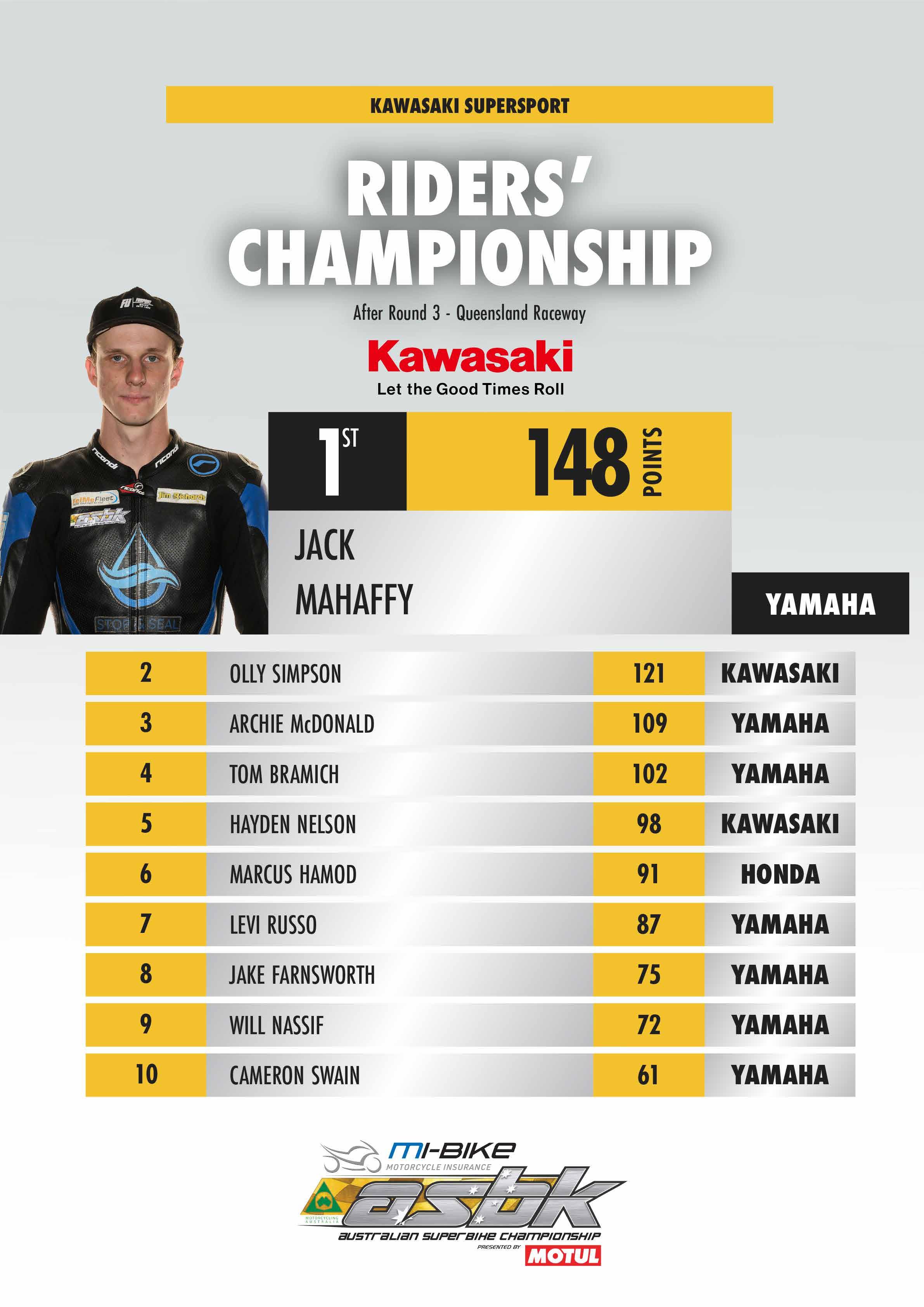 “The McMartin Racing Team continues to provide me with a fantastic motorcycle, and I’m just so happy with how this round has gone at a circuit I hadn’t won at before,” Waters said.