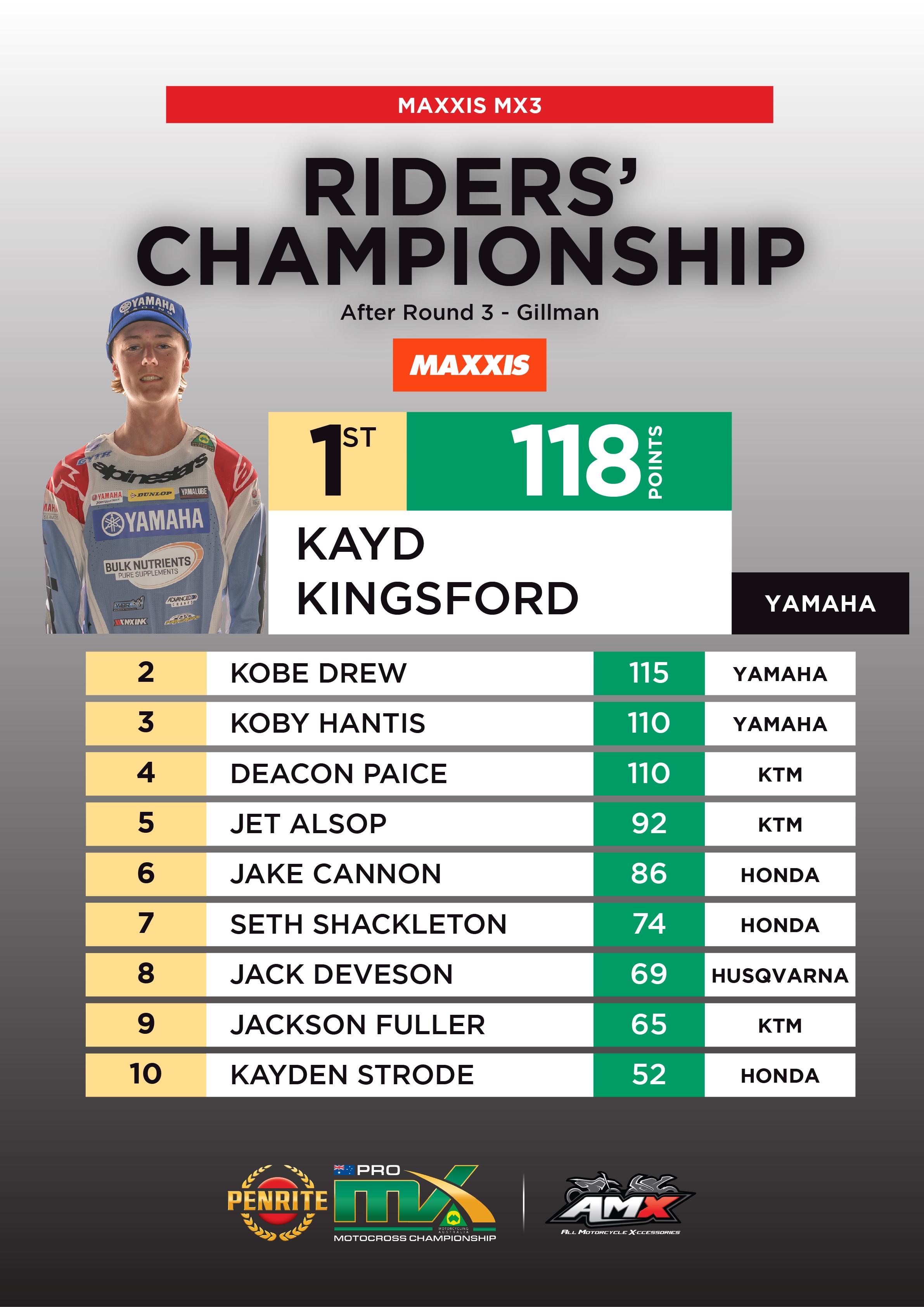 The round podium was topped by Cannon in a breakout ride, joined by Kingsford and Drew, which was enough for Kingsford to take charge of the championship lead and now three points ahead of Drew. Sixth overall at Gillman saw former leader Hantis slip back to P3 in the standings, eight behind Kingsford, while Cannon has climbed to P6.