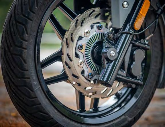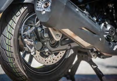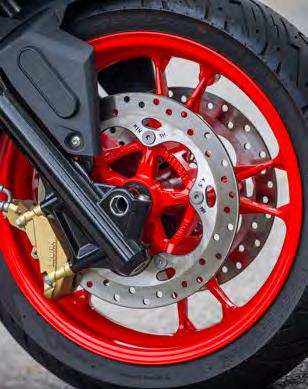 O sistema de freios conta com dois discos dianteiros de 265 mm, que são mordidos por pinças J Juan de quatro pistões montadas radialmente em parceria com um grande disco traseiro, que combinados oferecem excelente potência de frenagem. O ABS Continental de dois canais funciona muito bem, e nas frenagens mais fortes, quando o sistema entra em ação, a bomba ABS pulsa suavemente, mas percebi uma travagem de uma fração de segundo da roda dianteira. O controle de tração é de série e você pode desativar o sistema no menu de configurações, mas ele será redefinido sempre que a máquina for desligada.