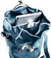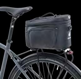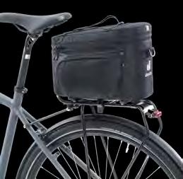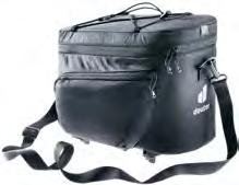 position, revealing either the BagFix quick-release system (for attaching to a bike rack) or the Contact back system with ergonomic shoulder straps. A roll-top opening with buckle closure provides quick access to contents and the removable organizer unit in the main compartment. The universal attachment options on the lid, plus a handy front pouch – for a helmet, say – are further practical organization and stow options.