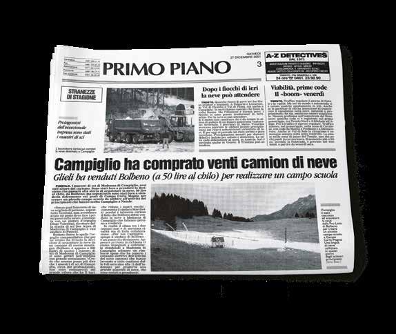 Redazione Editorial Staff Amministrazione Administration via Pradalago, 4 38086 Madonna di Campiglio (TN), T. +39 0465 447501 Direttore responsabile Managing Editor Alberta Voltolini Progetto grafico e illustrazioni Graphic design, layout and Illustrations Plus Communications, Trento Foto di copertina Cover photo Foto scattata presso Photo taken at the Panorama Hotel Fontanella di/by Marco Varoli Traduzione Translations Sara Salvatore Traduzioni sarasalvatoretraduzioni.it Stampa Press Esperia Tipografia, Trento