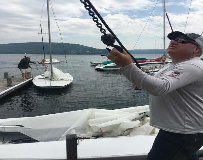 Whose line is it anyway?: (left) A Keuka Yacht Club member prepares to lift his MC scow from the water; Spencer Beaver tightens the main halyard line on the True Love