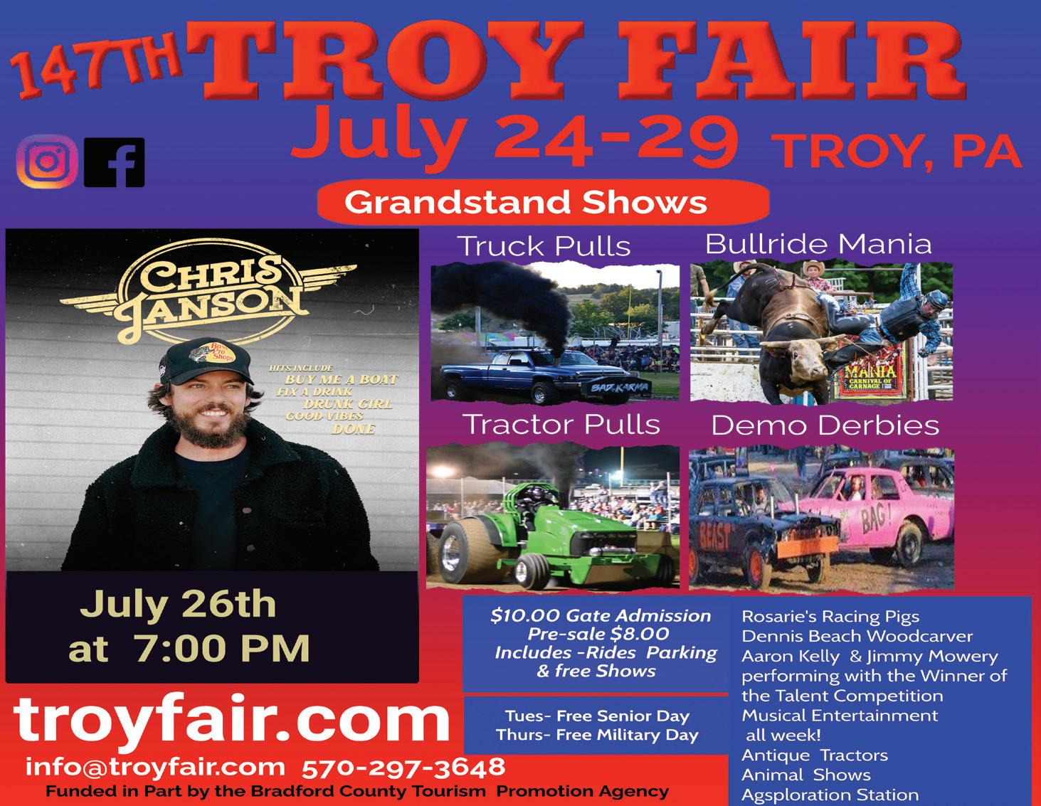 April 29-30, 2023 • 8:00 a.m. to 6:00 p.m. Alparon Park, 436 Gate 1 Lane, Troy Breakfast all day - Fresh Maple Syrup, Rides, Games, Food, Vendors, American Idol Meets the Voice Talent search live, winners to perform with Aaron Kelly & Jimmy Mowery, Pancake Eating & Mac & Cheese Comp, Antique Tractors, Open Goat Show, Wine-beer tasting, Demo Derby, Monster Truck Show and more! Admission$6.00 Adults, Children 5 & Under FREE admission. Rides $6.00 Wrist Band, FREE Parking. Visit www. maplefestivalpa.com, call Cathy Jenkins at (570) 297-3648, or email info@troyfair.com for more information. Rain or shine.