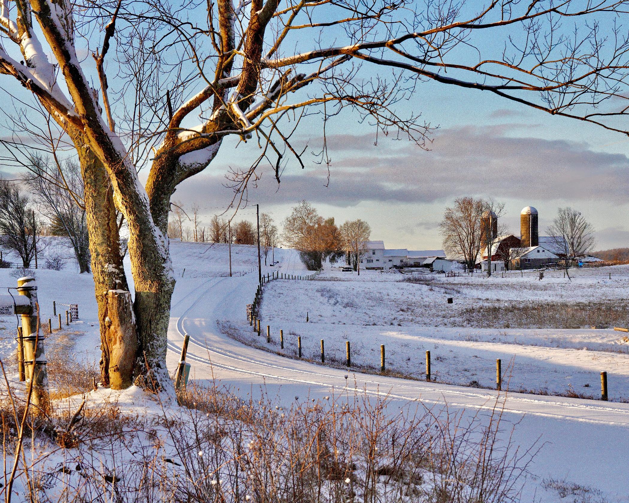 On this February morning, I headed to a spot near the intersection of Gee and Ridge Roads between Holliday and Tioga. High on the ridge it was cold and blustery. At 7:33 a.m. Saturday morning, there was a single car’s track in the road ahead. In the quietness of the morning, I thought about many things. One of my best friends was dying (and did die later that day). He loved this area. Next to me lived another friend, folks who’d farmed this land for six generations. Would there be a seventh? I hoped so, but farming is hard. I knew Heidi and her dad were already caring for the livestock in the barn next to me that morning. These are hearty folks. I know because my great-great-grandpa is buried in the cemetery just a mile away on Farmington Hill. Country life is a hard life, but it makes good people. As I thought this, the sun broke over the treetops behind the barn and lit up the gnarled tree. Everything about the scene comforted me—that old tree, the snow-covered road curving toward the farm ahead, those fence lines, and, of course, the golden tones of the sun.
