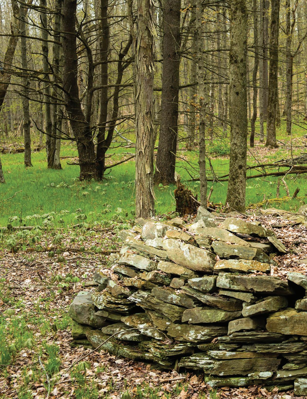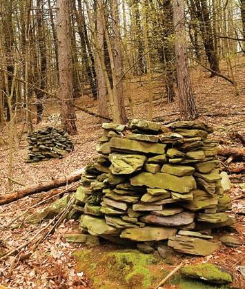 For years, Tioga County hunters have protected the locations of ancient aboriginal stonework in once-remote parts of the woods. Although they reach heights of several feet or higher, the coneshaped stone mounds—known as cairns—are so camouflaged into the landscape that they startle those who come across them. Locals know of developers who have destroyed the pillars, treating them as random piles of rocks that obstruct the landscape. Others, recognizing the cairns as centuries-old artifacts, have protected them by keeping quiet about their precise locations. This method of preservation has deterred vandals, but it has also hidden relics of the area’s rich Native American history from the public eye, leaving only those with access and curiosity to uncover the cairns’ purpose. Such a quest occupied one grouse hunter in Charleston Township for decades. (Names of some people and places are withheld to protect these cairns.)