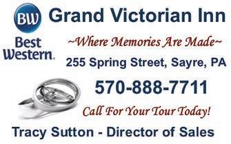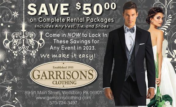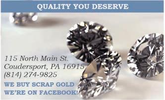 27 Hours: Tues-Thurs 12-9 Fri-Sat 11-10 Sun 11-8 107 11th Street Watkins Glen, NY (607) 210-6080 WWW.KOOKALAROCS.COM Daily Specials Tuesday - Thursday 4:30 - 6:30 p.m. Exits 48 or 51A off Route 17 & 86 NATIONAL SOARING MUSEUM SoaringCapitalofAmerica info@soaringmuseum.org Open Daily 10am-4pm 51 Soaring Hill Dr. Elmira, NY 14903 607-734-3128 Featuring one of the largest collections of Gliders and Sailplanes in the world. Gold Star Real Estate “We Treat Our Customers Like Gold” Full Time, Highly Trained, Professional Agents Residential • Camps & Cabins • Land • Multi-Family • Commercial 570-724-5921 Century21goldstarrealestate.com FOR SALE Gold Star Real Estate 570.724.5921 Best of Town and Country Build your dream house/camp/cabin on this idyllic, partially wooded two acres on the loveliest plateau in the hills above Wellsboro. Just seven miles from the historic and picturesque downtown, this 2.01-acre level lot— near thousands of acres of state and leasable private hunting lands—is ready to build. Driveway, water, septic, electric, and natural gas already in place. Call Sandra Wilson today to schedule your private showing. MLS# 31714184 $69,900 The Amber Rose Bridal Formal - Prom - Tuxes Beautiful Beginnings Start Here Call for an Appointment 570-368-2113 123 West Fourth Street Williamsport, PA 17701 www.theamberrosebridal.com