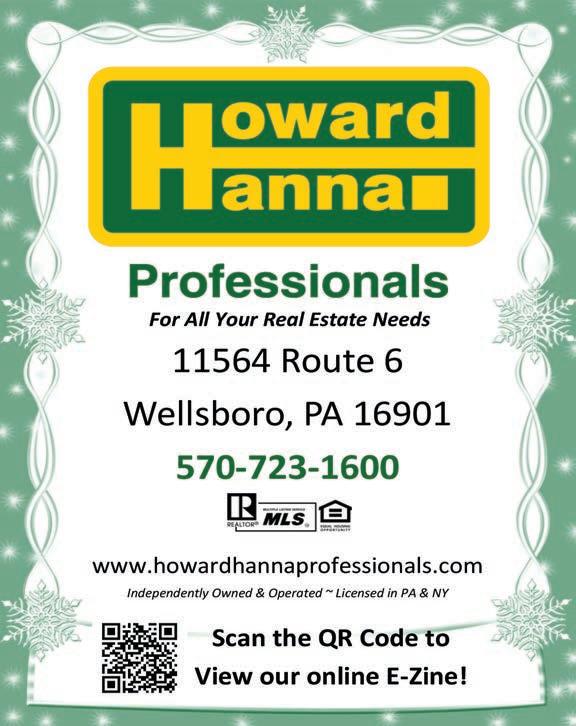 25 At Six West Settlements, Inc. we are, with excellence and integrity, dedicated to creating exceptional closing experiences for our customers. 477 Tioga Street • Wellsboro, PA 570-948-9166 SIXWESTSETTLEMENTS.COM REAL ESTATE CLOSINGS • REFINANCE CLOSINGS NO CLOSING FEE •QUICK TURNAROUNDS We have some of the best kept secrets that will make you wish you had discovered us sooner! Looking for a retreat in the Northern Tier of Pennsylvania? 570-948-1293 MVR-VR.COM New Main Street Location Coming Soon! Touch-Free Laser Wash Available! OPEN 24 HOURS Discounts up to 25% Off when purchasing packages online! Right at 2nd Light then 1/2 Mile (Route 6 - West) TIOGASTREETCARWASH.COM Real Estate Closings • Refinance Closings No Closing Fee • Quick Turnarounds At Serve-U Settlement, we are dedicated to taking the stress out of your Real Estate closings. We not only meet your expectations, we exceed them! Call 570.724.9800 or visit SERVEUSETTLEMENT.com to get started. Thinking of selling in 2023? Call us today! HAPPY New Year Thank you for making us the #1 Real Estate Offce in North Central PA — 3 years running! MVRWELLSBORO.COM Licensed in PA and NY