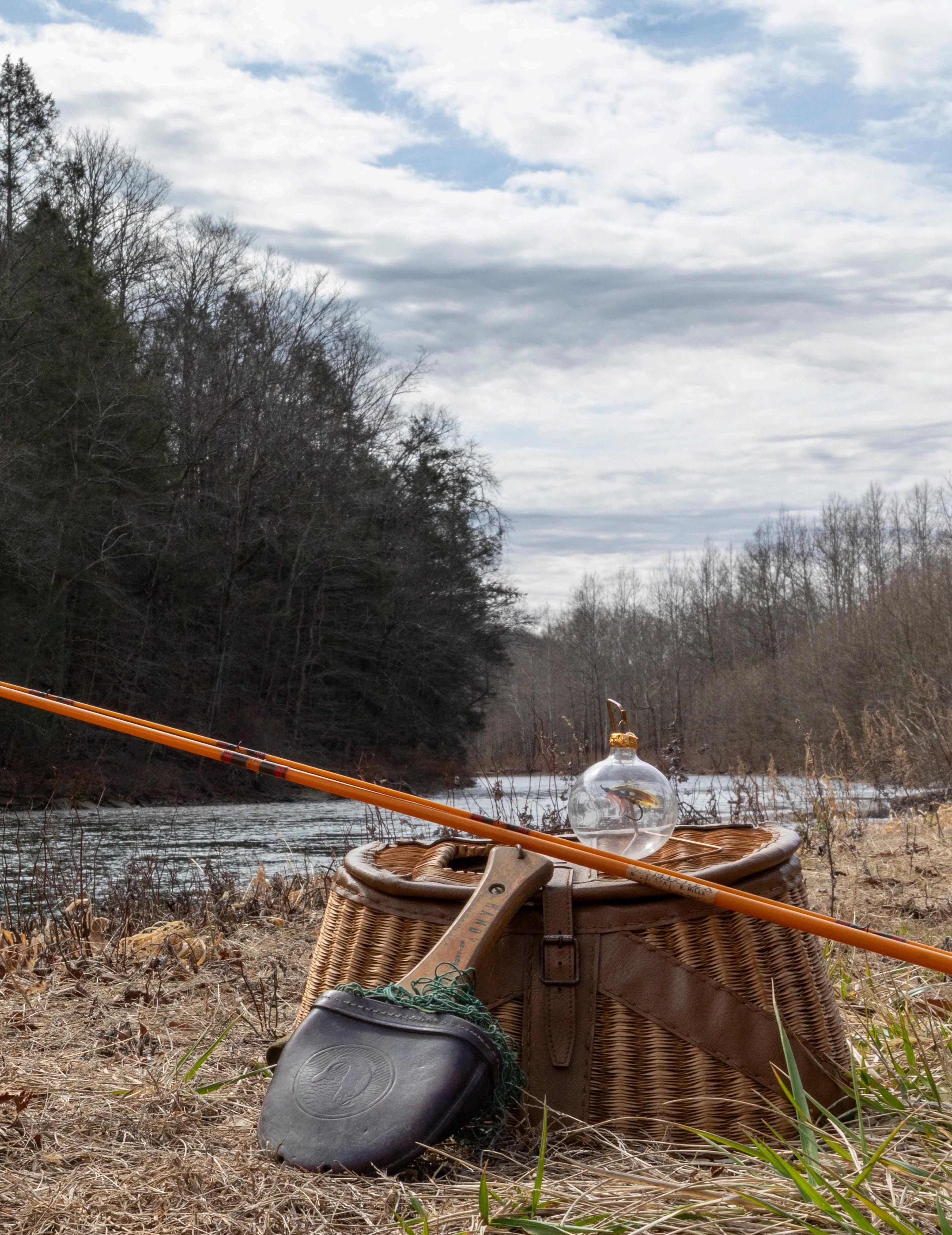 Leaning against a split willow creel are an E. Hille Lamiflex fiberglass fly rod and an early model Handy Pak folding net, made in Shamokin, with a wooden handle and leather sheath embossed with a fish; on top is an E. Hille Christmas ornament, with a Thunder and Lightning Atlantic salmon fly inside.