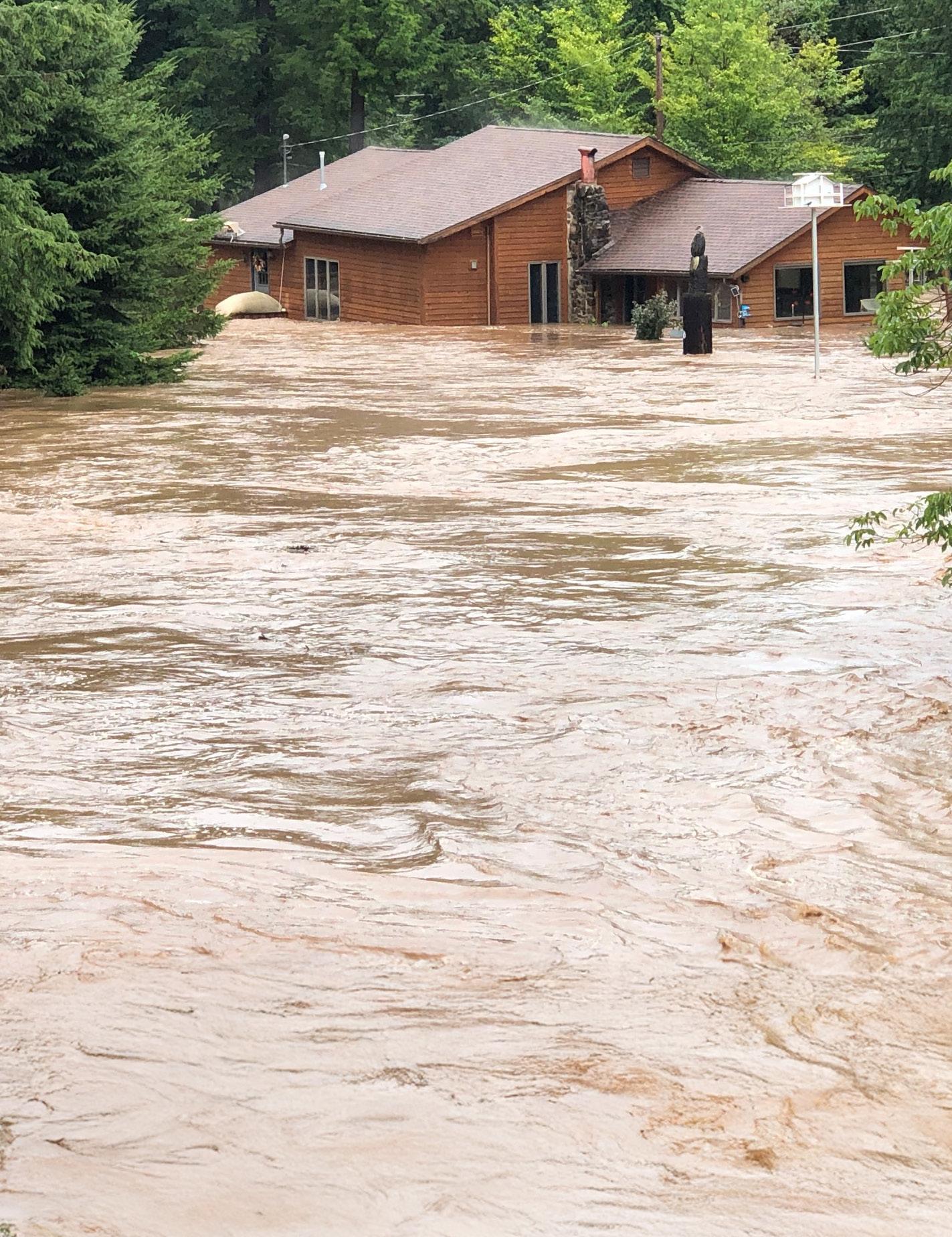 Idon’t even know how to put into words how terrifying and devastating this whole thing was. My house is located at the end of the little dead end road that runs along Route 49, near the Westfield Elementary school. The water just came so fast. It started lifting our floors, and with the pressure of the water coming from behind the house and under it we thought our house was going to come up off the foundation and be swept away. So we made the decision to get to higher ground. My husband, Nate, had Ruger, our English mastiff who weighs about 230 pounds, by his leash. Our sons Noah and Liam, sixteen and fourteen, respectively, were walking holding on to each other, and I was carrying Millie, a mixed breed weighing about forty pounds, and was going to go back for Stella, a Lab and bluetick heeler mix who weighs about fifty pounds. She was on the front deck, but the flood opened our front door so she went back inside the house. Noah had a book bag with his Chromebook, PS5, and cell phone. I almost told him to leave it, but I’m so thankful I didn’t. We started walking through the water. It was thigh deep when we got to the end of the house, and it quickly reached chest level, sweeping us out into the front field. Then it was well over our heads and we could not touch ground anywhere. The current was taking us toward Route 49 where there would be nothing to hold onto. The current was coming from both Cowanesque Creek and North Fork Creek. We were all struggling to keep our heads up. I still had Millie, trying to keep her up out of the water, but Nate had to let go of Ruger to try to help our boys. My oldest son, Alex, twenty-one, was trying to get to our house, but the roads were flooded and he was trapped on Route 49 watching all this. He saw Ruger get swept away, so he took off running to get him. He thankfully did not see us all go under after that, because I know if he had he would have jumped in and tried to help us, and it was an even deeper and stronger current in that end. Alex ended up getting swept in. His friend, Nick, saw him and he jumped in to try to help. The water carried them both away, but they were able to grab onto the wooden decorative bridge at Westfield Elementary. They held on until the water receded enough to get themselves out.