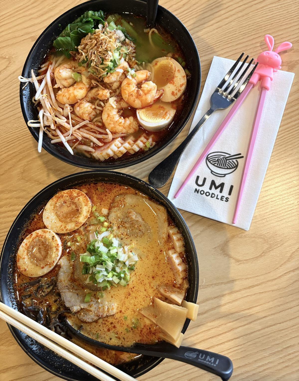Max (owner) and Joey (server extraordinaire) find a few seconds to pause behind the counter seating at the back of Umi Noodles. On the wall behind them it says “Sad Me + Noodles = Happy Me,” and the curry laksa and prawn noodle soup made this writer very happy.