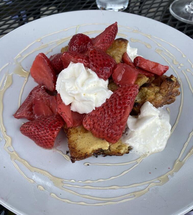 The porch, both the covered and open sections, is there to be enjoyed with drinks. The full bar inside has big windows and stocks spirits from local Myer Farm Distillers (see the February 2024 cover story). The deck is great for sipping coffee and a leisurely breakfast, starting at 8 a.m. Katy, who was food and beverage manager/chef for the Finger Lakes GrassRoots Festival since 1991 and catering director at a variety of local spots, says, “It’s easiest to think of the schedule as being layered. Lunch opens at 11 a.m., but the coffee shop stays open ’til noon.” The coffee shop is open seven days a week, and lunch is Monday through Friday, because Saturday and Sunday is all about brunch. Stuffed French toast. The Classic with scrambled eggs, cheddar, and chives, sourdough toast, thick cut bacon, and roasted fingerlings with herbs and shallots. And the best eggs benedict this writer has ever had. Dinner is served 5 to 9 p.m. Wednesday through Sunday. “People know about our brunches because they’ve been happening for two years,” Katy says. “They’re starting to discover we serve dinner this season.”