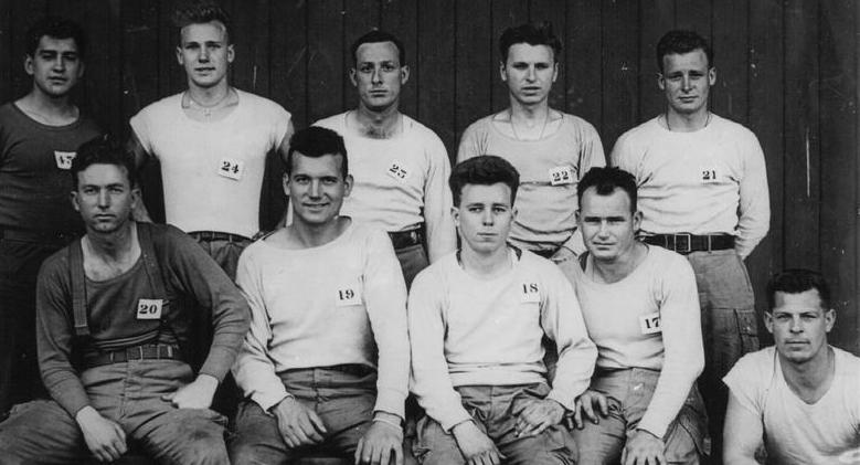 The para volunteers sent to Ft. Bragg’s adjunct, Camp Mackall, brought their bare essentials: toiletries, army uniforms, baseballs, and gloves. After a day of rigorous training, the troopers tossed a ball around. It wasn’t long before one outfit challenged another to a real game. The camp athletic officer organized a league and set a schedule. The Red Devils lost their first three games. They reorganized and went on a win streak, finishing the season with a 26-4 won-lost record to capture the Ft. Bragg-Camp Mackall championship. Okey Mills threw a no-hitter in the final game.