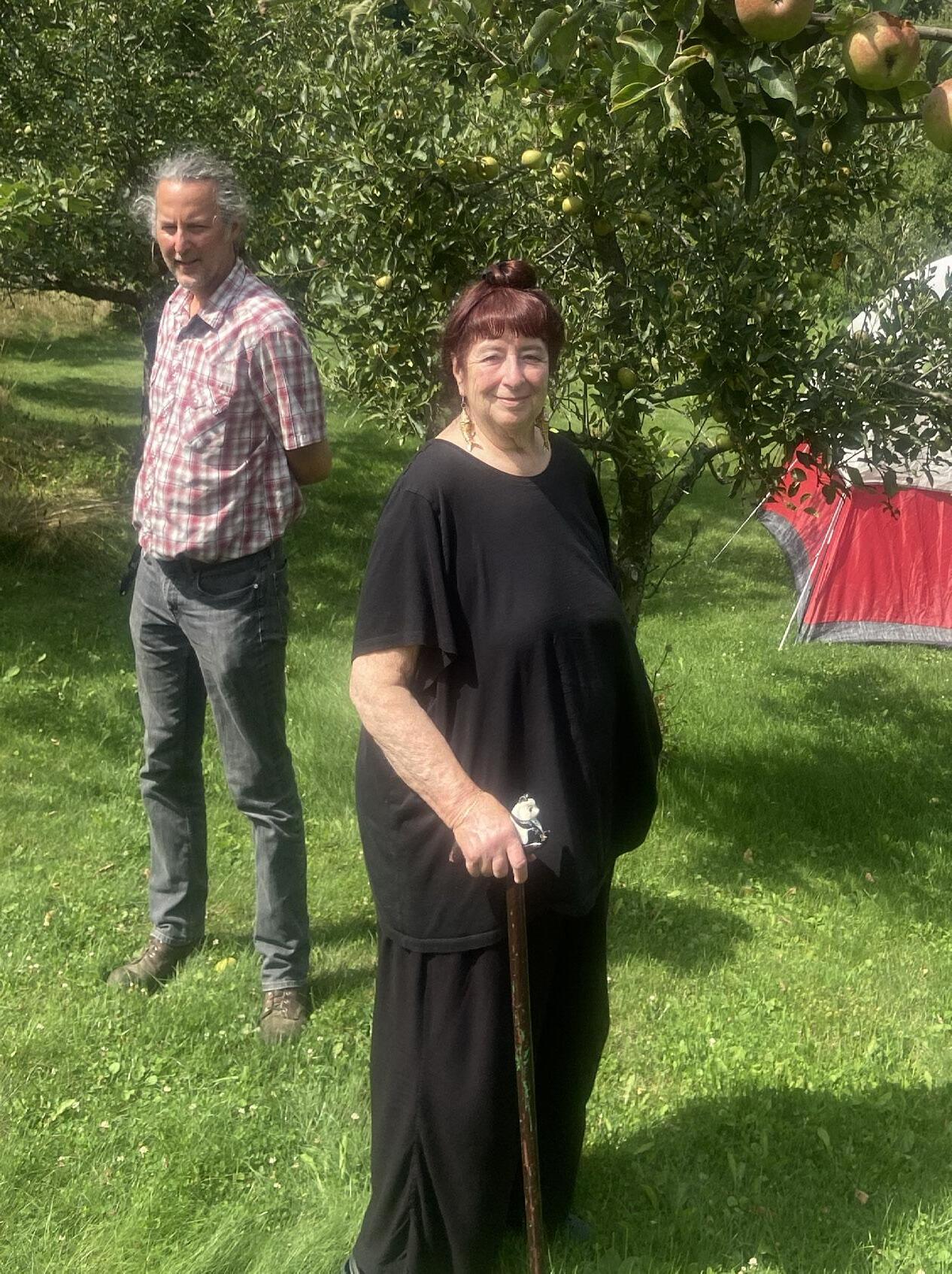 He cuts an apple from a variety called Major into slices, and offers one to Peggy. “Good tannins,” she says. He slices into a Kingston Black. Nice acidity, they agree. Steve remarks the fruit has “taken off” in this summer’s high heat and heavy rains. “Harvest might be two weeks early.”