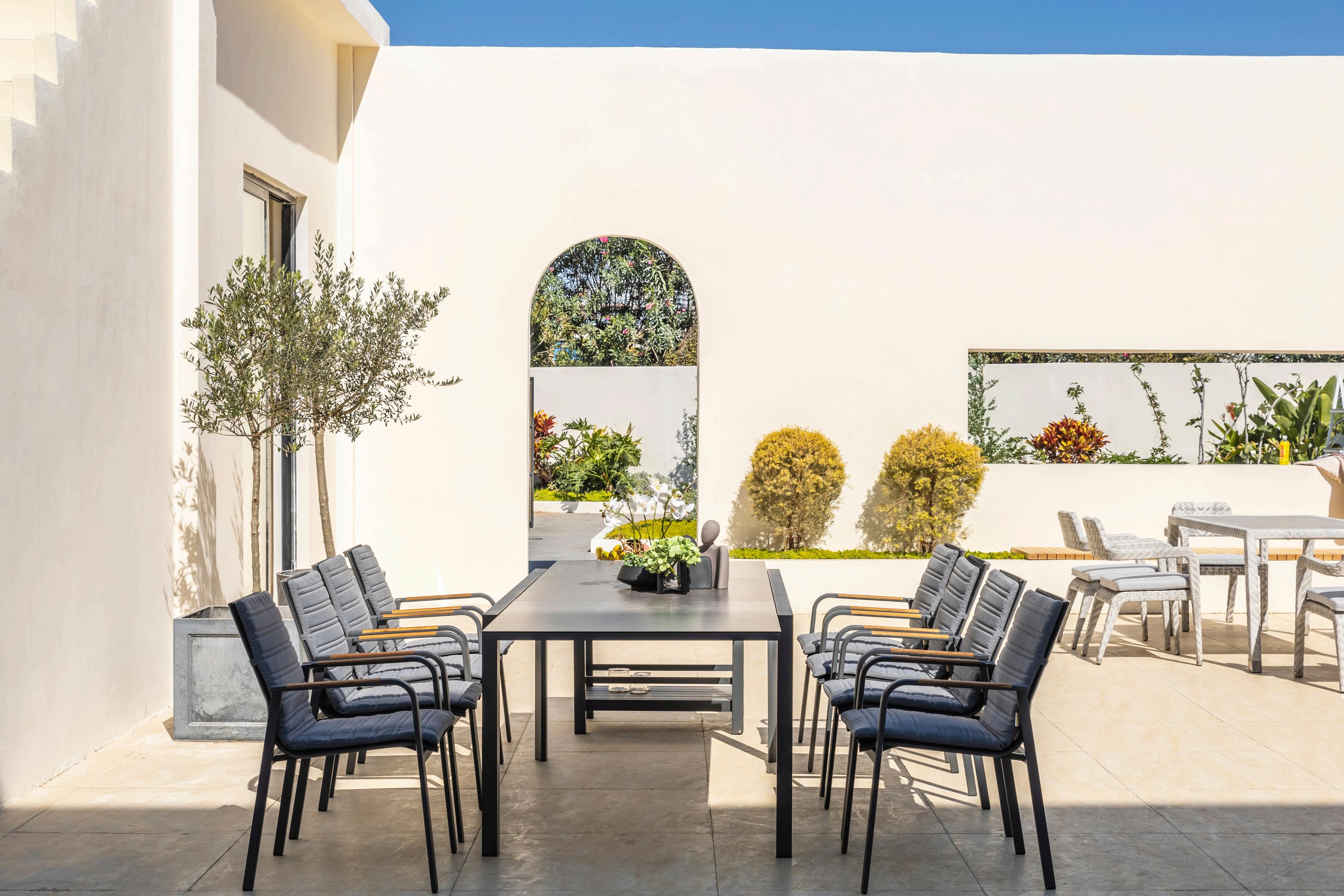 Sofia Collection is a modern collection that combines aluminum and teak. Built with high backs and deep seating, this collection is made for everyone to enjoy!