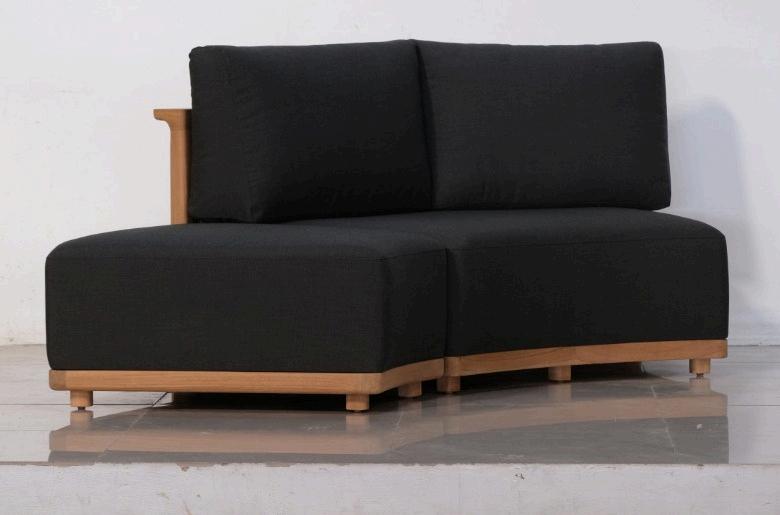 This unique collection is designed with elegance. The teak frame and light grey fabric compliment the open sides and wrapped back.