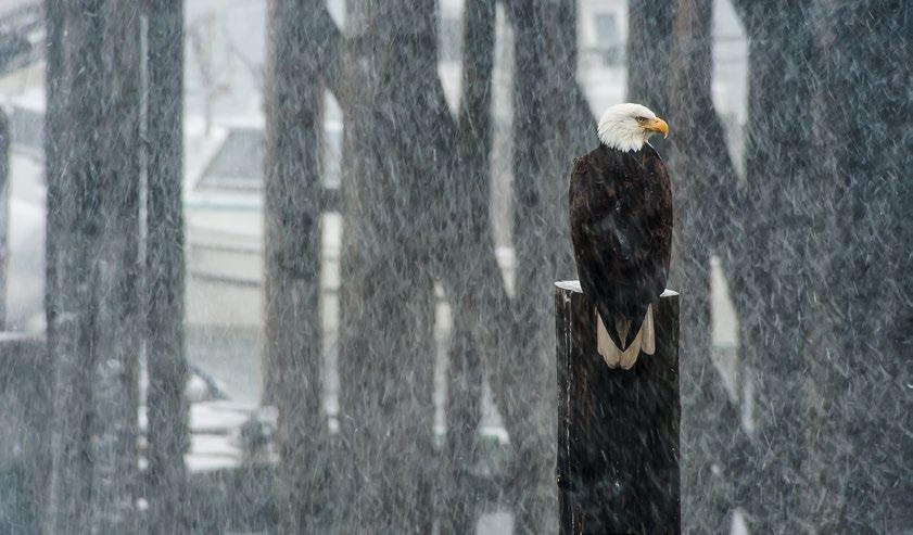The underwater world mirrors the winter cycles of the surface, seasonal kelp and seaweed die off to reveal stark, coralline algaecovered rock that is home to a wide variety of invertebrates. Dense bull kelp forests are reduced to a few ghostly stipes, ragged blades trailing in the current. What’s withstood the winter swell lies vulnerable to the slow march of hungry urchins. Once kept in check by healthy populations of sea otters and sea stars, these urchins can create full-blown barrens in an unbalanced ecosystem. But the bull kelp has left assurances, dropping reproductive patches from its fronds to the seafloor before winter began.