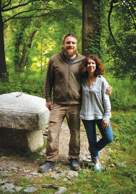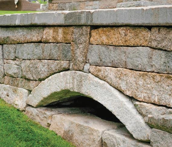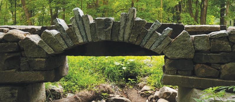 Opposite, clockwise from top left: A Soake Pool framed in reclaimed granite, its natural patina complementing the clarity of the water. Third-generation master stonemason Matt Mastromarino with Karen Larson, cofounder of Soake Pools. Layered reclaimed stone carefully composed around the pool. A reclaimed stone arch repurposed as a sculptural garden feature. A 7’x13’ full plunge and 4’x4’ cold plunge integrated into a historic New England terrace, shaped by stone and water.