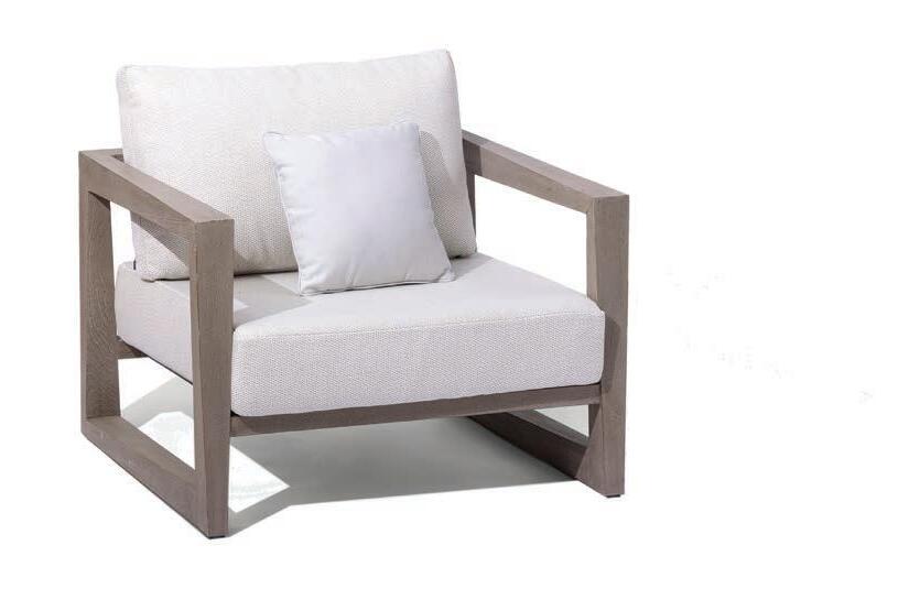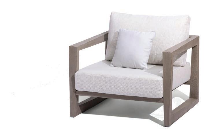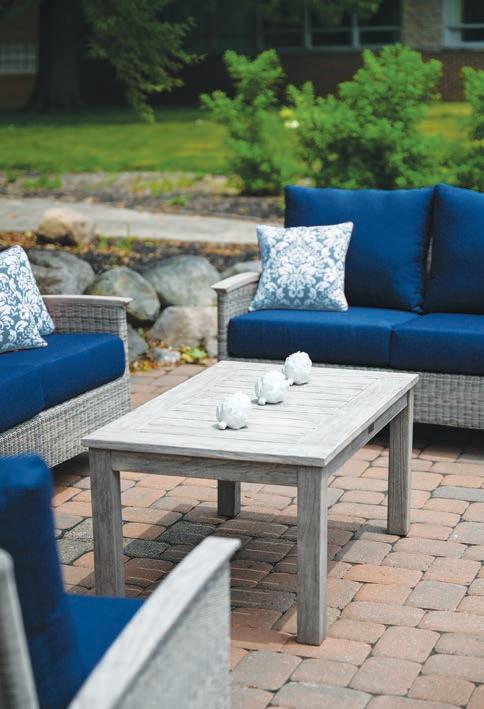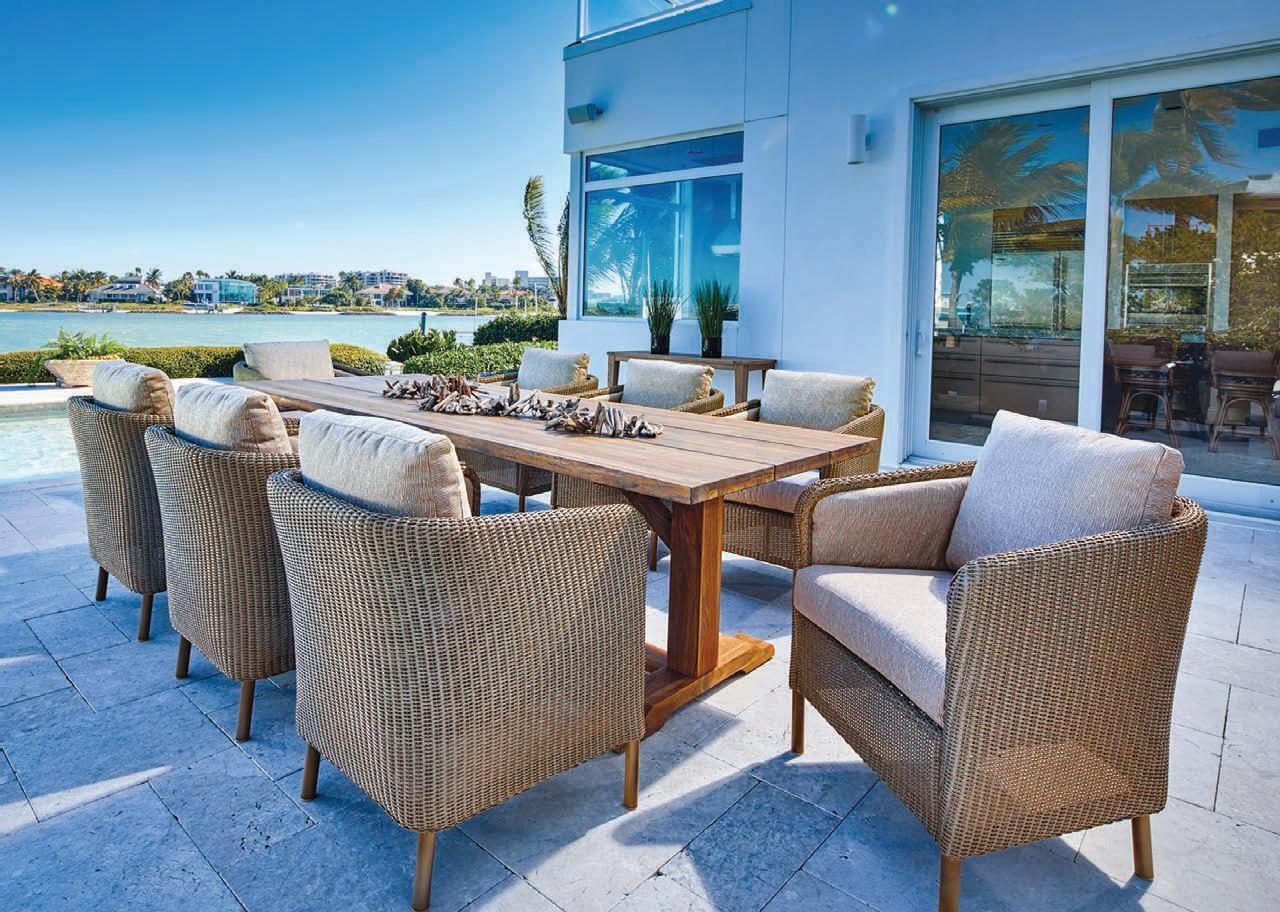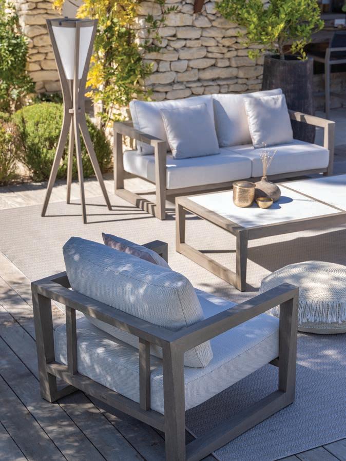 Right: Les Jardins uses a proprietary method to age and seal teakwood, resulting in the style and durability of wood without the maintenance. Skaal deep seating is shown.