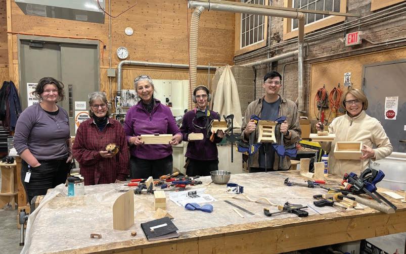 Claremont Makerspace Artist in Residence Margo Dunlap (far left) with CMS members during their Bandsaw Box class.