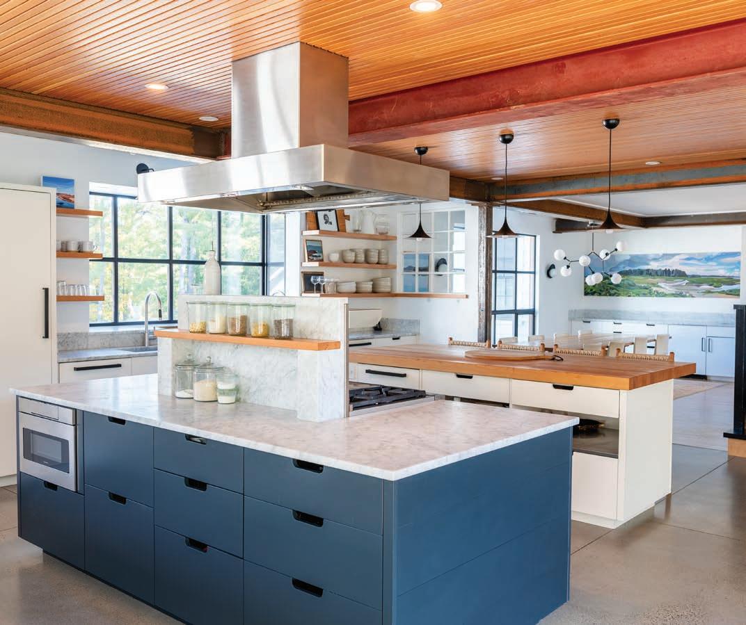Right: The lovely blue island plays nicely with the client’s artwork by Maine artists Joshua Adam and Susan Parish Adam. Their works can be found at Adamgalleryonline.com.