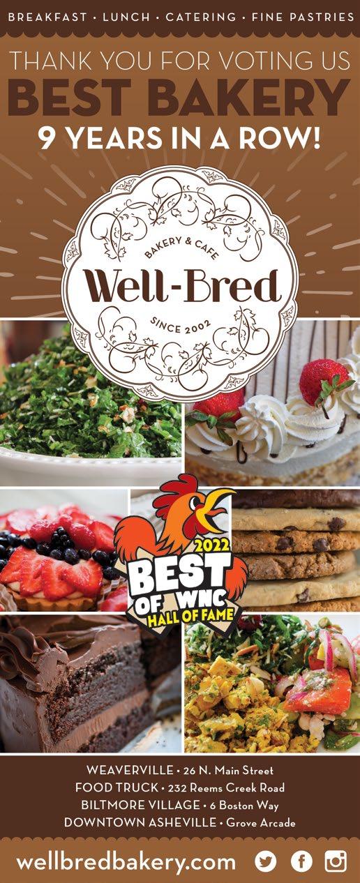 134 2022/2023 X Awards | Best Of WNC BUSINESS THAT BEST REPRESENTS THE SPIRIT OF YOUR TOWN 1 BLUE MOUNTAIN PIZZA x 55 N. Main St., Weaverville 828-658-8778 • bluemountainpizza.com 2 WELL-BRED BAKERY & CAFÉ 26 N. Main St., Weaverville 828-645-9300 • wellbredbakery.com 3 WAGBAR 320 Merrimon Ave., Weaverville 828-337-4964 • wagbar.com BREAKFAST RESTAURANT 1 WELL-BRED BAKERY & CAFÉ x 26 N. Main St., Weaverville 828-645-9300 • wellbredbakery.com 2 YELLOW MUG COFFEE LOUNGE 113 N. Main St., Weaverville 828-484-8844 yellowmugcoffeelounge.com 3 STONEY KNOB CAFE 337 Merrimon Ave., Weaverville 828-645-3309 • stoneyknobcafe.com LUNCH RESTAURANT 1 WELL-BRED BAKERY & CAFÉ x 26 N. Main St., Weaverville 828-645-9300 • wellbredbakery.com 2 STONEY KNOB CAFE 337 Merrimon Ave., Weaverville 828-645-3309 • stoneyknobcafe.com 3 TWISTED LAUREL (WEAVERVILLE) 10A S. Main St., Weaverville 828-645-2700 • twistedlaurel.com DINNER RESTAURANT 1 STONEY KNOB CAFE 337 Merrimon Ave., Weaverville 828-645-3309 • stoneyknobcafe.com 2 GLASS ONION 18 N. Main St., Weaverville 828-645-8866 • glassonionasheville.com 3 BLUE MOUNTAIN PIZZA 55 N. Main St., Weaverville 828-658-8778 • bluemountainpizza.com COFFEE & SWEETS 1 WELL-BRED BAKERY & CAFÉ x 26 N. Main St., Weaverville 828-645-9300 • wellbredbakery.com 2 YELLOW MUG COFFEE LOUNGE 113 N. Main St., Weaverville 828-484-8844 yellowmugcoffeelounge.com 3 ALLGOOD COFFEE 10 S. Main St., Weaverville 828-484-8663 • allgood.coffee LOCAL BAR/BREWERY/ WATERING HOLE 1 ELUVIUM BREWING CO. 11 Florida Ave., Weaverville 828-484-1799 • eluviumbrewing.com 2 WAGBAR 320 Merrimon Ave., Weaverville 828-337-4964 • wagbar.com 3 BLUE MOUNTAIN PIZZA 55 N. Main St., Weaverville 828-658-8778 • bluemountainpizza.com SMALL TOWNS CONTINUED WELL-BRED BAKERY & CAFE Best Breakfast Restaurant, Best Coffee & Sweets, Best Lunch Restaurant and Best Bakery (Sweets/Desserts/Cookies) in Eats; second place Business That Best Represents the Spirit of Your Town PHOTO COURTESY OF CAROL SPAGNUOLA WEAVERVILLE & WOODFIN