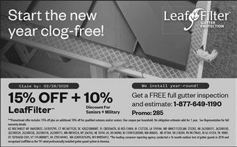 LeafFilter is the most advanced gutter protection for your home, backed by a no-clog guarantee and lifetime transferable warranty. Call today 1-877649-1190 to schedule a FREE inspection and no obligation estimate. Plus get 20% off! Seniors and military save an additional 10%. Restrictions apply, see representative for warranty and offer details. (NC Press)