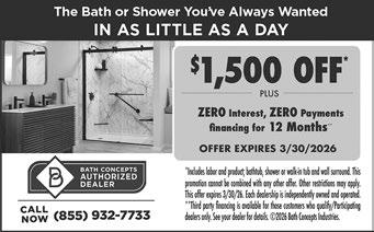 GET A HIGH QUALITY, MODERN DESIGN BATH or shower transformation in as little as One Day. $0 Down, $0 Installation, $0 Payments for 12 months! Call: 1-877243-7050. (NC Press)