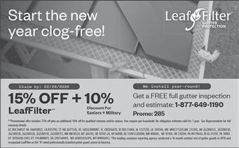 LeafFilter is the most advanced gutter protection for your home, backed by a no-clog guarantee and lifetime transferable warranty. Call today 1-877-649-1190 to schedule a FREE inspection and no obligation estimate. Plus get 20% off! Seniors and military save an additional 10%. Restrictions apply, see representative for warranty and offer details. (NC Press)