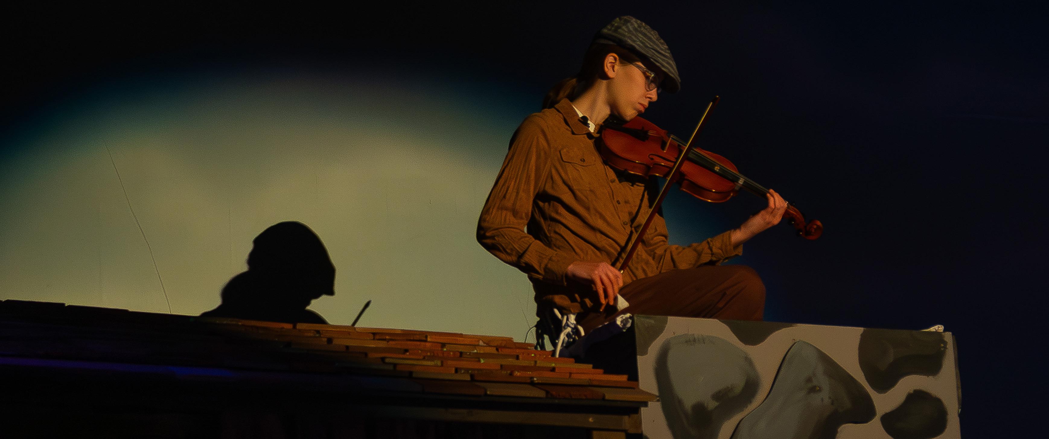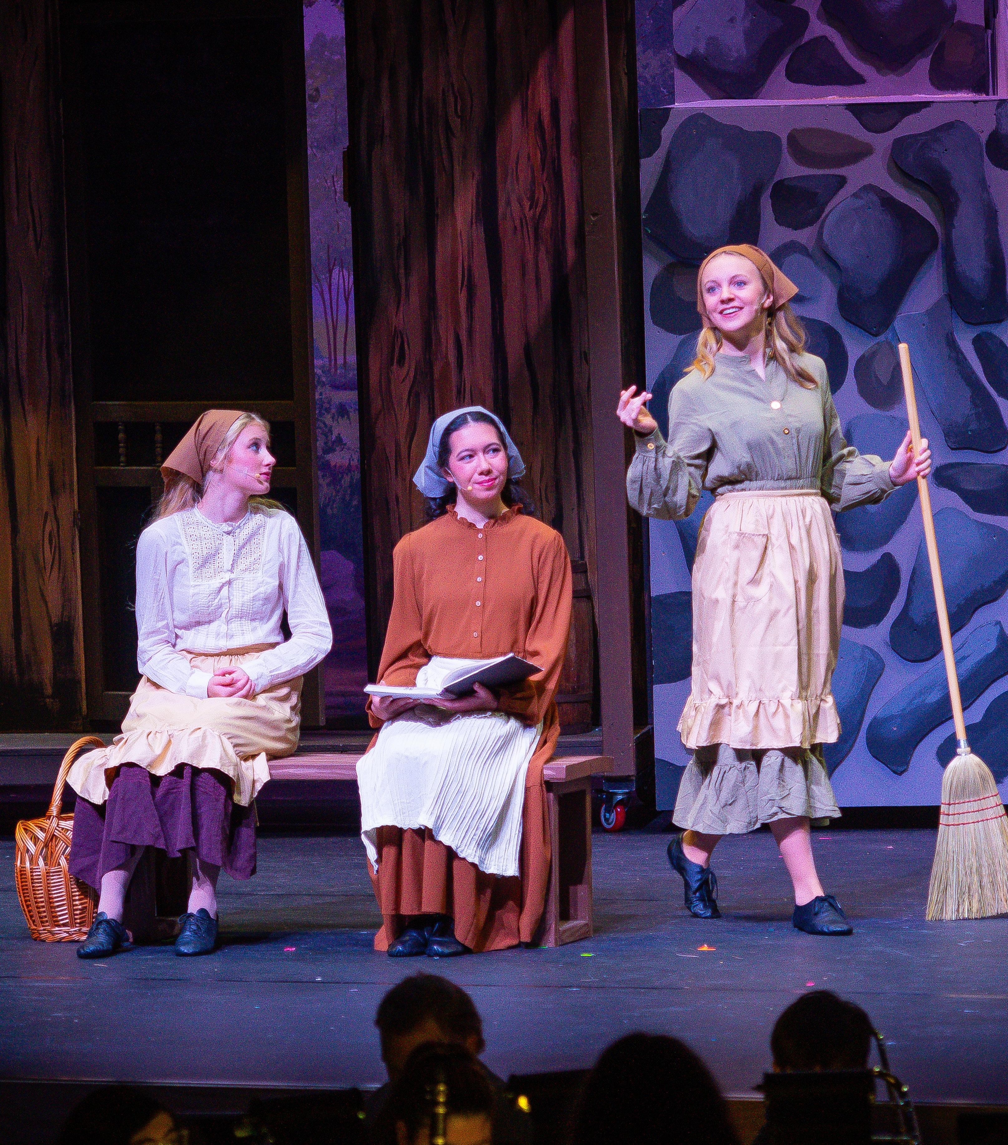 As always, the incredible student stage crew provided invaluable support in executing Mrs. Newell’s vision. Stage managers Roz Herlihy ’26 and Laura Wallace ’28 led a team of over 35 crew members to create the set, props, and costumes as well as run the sound and lights for the show. Director of Music Mrs. Natalie Utz ’15, conducted the talented pit band, made up of MDSA and MSJ students along with a few pros. Eva Grace Sullivan ’28 pulled double duty, playing violin with the band and then jumping on stage to become the Fiddler, playing the iconic theme perched on the roof of the farmhouse.
