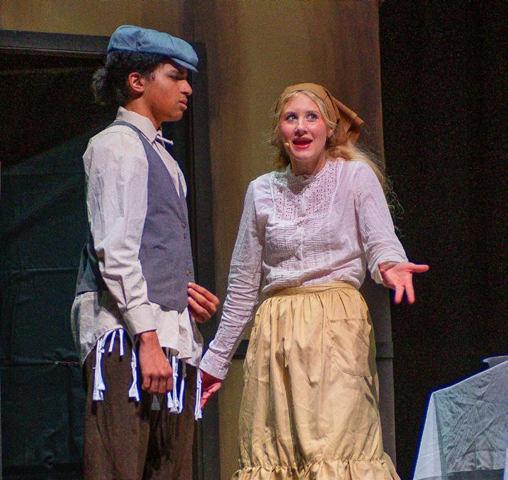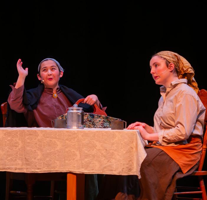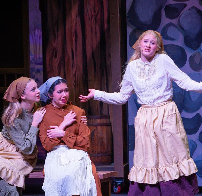 Tevye, the main character and dairy farmer with five daughters, was played by Leo Kirby MSJ ’27. His amazing vocals, heartfelt interactions with his family, and hilarious side conversations with God made for an Oscar-worthy performance. June Newell ’26, a wonderful character actress, was his perfect match, playing Tevye’s wife Golde. Fabulous performances by Nat Johnson ’26 as Grandma Tzeitel and Megan McCaffrey ’26 as Fruma-Sarah helped Tevye tell his tale. Other strong performances included the three oldest daughters Tzeitel (Emma Brady ’26), Hodel (Reagan Woody ’26), and Chava (Kara Strong ’26), each finding love and challenging the idea of tradition. Maria Marston ’26 was hysterical as the matchmaker, Yente, and the lovely voices of Lila Gagnier ’27 and Teresa Kurek ’28 rounded out the family. The ensemble of