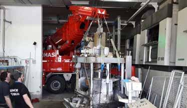 Extracción de una máquina de grabación de cilindros para la industria gráfica de una máquina de 3 metros de anchura y 8 metros de largo de 16 toneladas con una Liebherr LTM 1040 y la otra una Grove 2040.