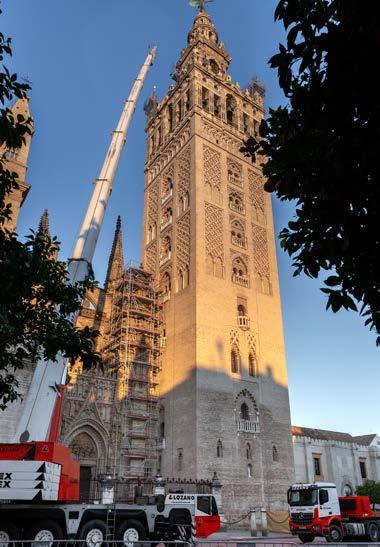 92 Grúas Lozano participa en el delicado descenso de las azucenas de la Giralda