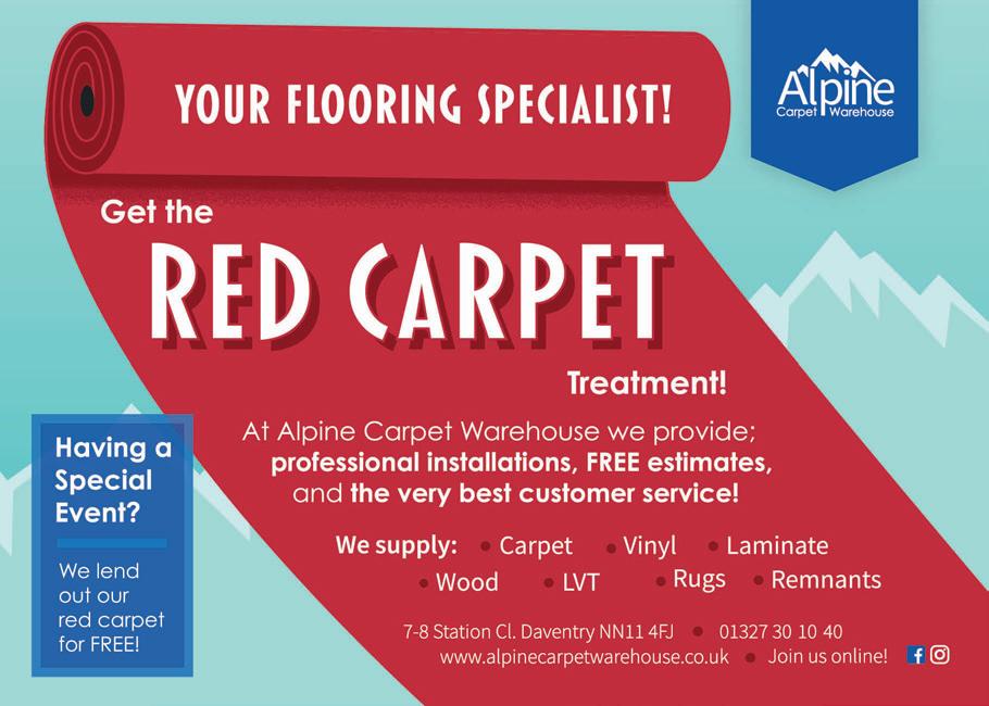 naturalanimalnutrition.com Tel: 07398 891622 uprawpetfoods.co.uk Tel: 07368 112333 Stockists of Durham, Totally Natural, Birmingham, Raw, plus our own Natural Animal Nutrition range and more… You’ll find frozen food, bones, carcass, lots of treats and our friendly team available to advise. We make our own range of natural food and are happy to create bespoke meals for your dog. Our friendly team will be happy to help. Does your dog have health issues that require a special diet? NOW OPEN AT WEEDON BEC 9am – 5pm 6a The Old Depot, Weedon Bec, NN7 4PS 9.30am - 5.30pm 304 Heathfield Way, Northampton, NN5 7QP A COSY, FAMILY RUN MICRO PUB TUCKED AWAY IN A SIDE STREET RIGHT IN THE HEART OF DAVENTRY. earlydoors19@outlook com CONTACT US Early Doors Daventry earlydoorsdaventry www earlydoorsdaventry com DAVENTRY EARLY DOORS MICRO PUB • REAL ALE • LOCAL CIDER • CRAFT GINS • FINE WINES Looking for Outstanding quality childcare in Daventry? Ashby Road, Daventry NN11 OQF Quality nursery childcare for children aged 3 months to 5 years set across 4 classrooms Qualified and experienced staff with Early Years Teaching Status Secure outdoor play area with all-weather surfacing Exciting Out of School and Holiday Club for children aged up to 11 years with range of sessions available Hot healthy and well-balanced meals prepared on the premises Discounts for full time and siblings, Government funded places and work-place vouchers accepted. www.dolphindaynursery.com 01327 301600