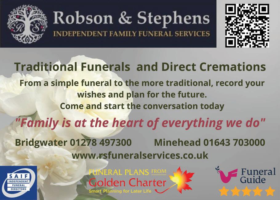 Robson & Stephens INDEPENDENT FAMILY FUNERAL SERVICES LovelyBoutique 01643 706458 1 The Parade Minehead, Somerset TA24 5NL lovelyboutique.co.uk Stockists of Joe Browns , Irregular Choice, Vendula, Mistral, Nomads, Mudd and Water, Erstwilder, Joma and so much more Minehead Radio Ltd Laundry Refrigeration Dishwashers Cooking Floorcare TV & Entertainment Heating & Air Treatment Small Appliances We Sell Come in and see our extensive range of goods; our friendly and knowledgeable staff will be pleased to help you make the right choices. We also focus on after sales service from delivery to installation. 19-21 Friday Street, Minehead Somerset, TA24 5TH THE OWLS ROOST The Avenue , Minehead, United Kingdom, TA24 5NN “ THE CAFE IN THE TREE TOPS ” MON-SAT 09:30-14:30 SUNDAY CLOSED FOLLOW US ON FACEBOOK Home cooked food ● All day Breakfasts Daily Specials ● Tea ● Coffee ● Cakes