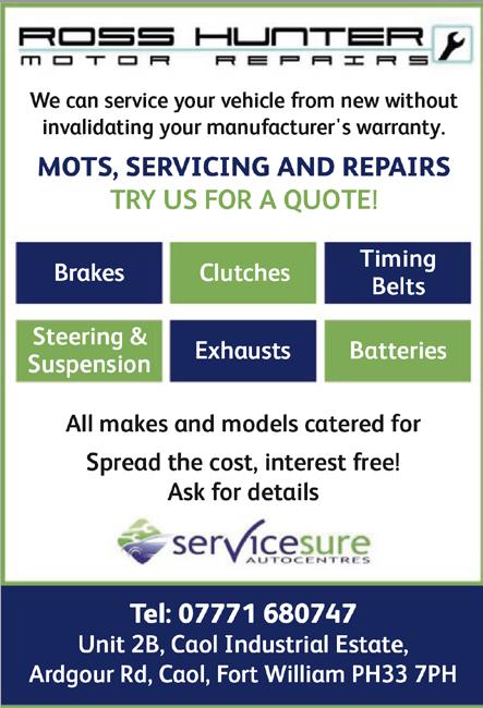 For all your car care, accessories & parts please call 01397 702134 Follow us on Facebook for updates and offers @BandHAutospares Unit 1 Claggan RD, Fort William, PH33 6PH 20a (first floor) Ben Nevis Ind Est, Fort William PH33 6PR 01397 700 563 Professional and Reliable Bridal Services for Hair and Make up ABOUT BONNYS WONDERLAND BRIDAL ENQUIRIES: Via email or contact form 07944 301 606 or 07398 552 981 We opened the doors to the first Bonnys Wonderland salon with Individual professionals offering hair, beauty, aesthetic, and cosmetic treatments including spa and more in a clinical environment. Appointments & Free consultations can be booked online via our booking system. www.bonnyswonderland.co.uk Scan the QR code to BOOK NOW! Unit 9 Tweeddale High Street, Fort William PH33 6EU Dine-in OR Takeaway MENU INCLUDES All Day Breakfasts incl Vegetarian & Vegan Italian / American 12” Pizzas The best 6oz Scottish Steakburgers American Pancakes / Waffles drizzled in Maple Syrup SLIPWAY AUTOS LTD. M.O.T Testing Station (Classes 4, 5 and 7) Car, Commercial and Accident Repairs Bodywork • Car Sales RENTAL LOCATION Find us: Annat Point Industrial Estate Corpach, Fort William PH33 7NB Tel: 01397 772404 www.slipwayautos.co.uk