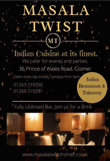 Your Local Property Experts 15 West Street, Cromer NR27 9HZ www.henleysea.co.uk 01263 511111 GET AN INSTANT QUOTE ONLINE 07881 294539 facebook.com/coalshack SMOKELESS COAL KILN DRIED FIREWOOD READY TO BURN FIND US ON FB NEW STREET, CROMER, NORFOLK, NR27 9HP TO BOOK OPEN 11AM DAILY “QUALITY FOOD ON THE NORTH NORFOLK COAST” FULL MENUS AVAILABLE ONLINE WWW.LILYMAISBGC.CO.UK 01263 511559 INFO@LILYMAISBGC.CO.UK TRUST US. Book Locally ABTA No. 91207 01692 406655 www.broadland.co.uk 41 Market Place, North Walsham NR28 9BT WHY BOOK WITH US? FINANCIAL PRO TE CT IO N QU ALIT Y SERVIC E UNBIASED ADVICE W ORLDWIDE DESTINA TIONS GRE AT VA LU E FINANCIAL PRO TE CT IO N UNBIASED ADVICE W ORLDWIDE DESTINA TIONS FINANCIAL PRO TE CT IO N QU ALIT Y SERVIC E UNBIASED ADVICE W ORLDWIDE DESTINA TIONS GRE AT VA LU E FINANCIAL PRO TE CT IO N QU ALIT Y SERVIC E UNBIASED ADVICE W ORLDWIDE DESTINA TIONS GRE AT VA LU E FINANCIAL PRO TE CT IO N QU ALIT Y SERVIC E UNBIASED ADVICE W ORLDWIDE DESTINA TIONS GRE AT VA LU E