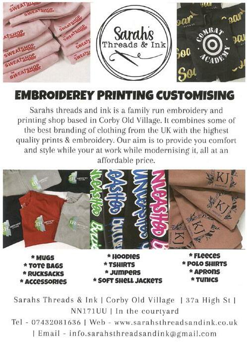 Serving outside the Cardigan Arms The Jamb, Corby Old Village Homemade food, cakes & service with a smile Breakfasts • Lunch Menu & Specials • Cakes Full range of Jute coffees & selection of teas Plenty of outside seating available. If you’d prefer to sit inside we kindly ask that you purchase your drinks from the bar kcscafe91 E N T E R T A I N M E N T VIRTUAL REALITY FOR EVERYONE! With over 50 VR games to choose from, ViRAL Entertainment is ideal for Birthday Parties, Stag & Hen parties, Team Building, Corporate Events & much more! Book your experience today! “If you can flush a toilet and flick on a light, you can enjoy VR, it really is that simple!” VR RACING Experience our state-of-the-art VR Racing Simulators. Our 5D virtual reality racing uses the latest in VR technology that gives true immersion. We have 5 Racing Sims available can be booked together to race in multiplayer. Find us: 3-5 Corporation St. Corby, NN17 1NG Find out more & Book at: www.viralentertainment.co.uk | Tel: 07944 531243 | CHECK OUT OUR NEW EXCITING DEALS Sarahs threads and ink is a family run embroidery and printing shop based in Corby Old Village. It combines some of the best branding of clothing from the UK with the highest quality prints & embroidery. Our aim is to provide you comfort and style while you’re at work while modernising it, all at an affordable price www.sarahsthreadandink.co.uk T: 07432 081636 E: info.sarahsthreadsandink@gmail.com • MUGS • TOTE BAGS • RUCKSACKS • ACCESSORIES • HOODIES • TSHIRTS • JUMPERS • SOFT SHELL JACKETS • FLEECES • POLO SHIRTS • APRONS • TUNICS 37a High Street, NN17 1UU (In the courtyard) To advertise in this magazine contact us now by calling 0117 3704377 or by emailing info@onscreenmagazine.co.uk ADVERTISE HERE CONTACT USNOW