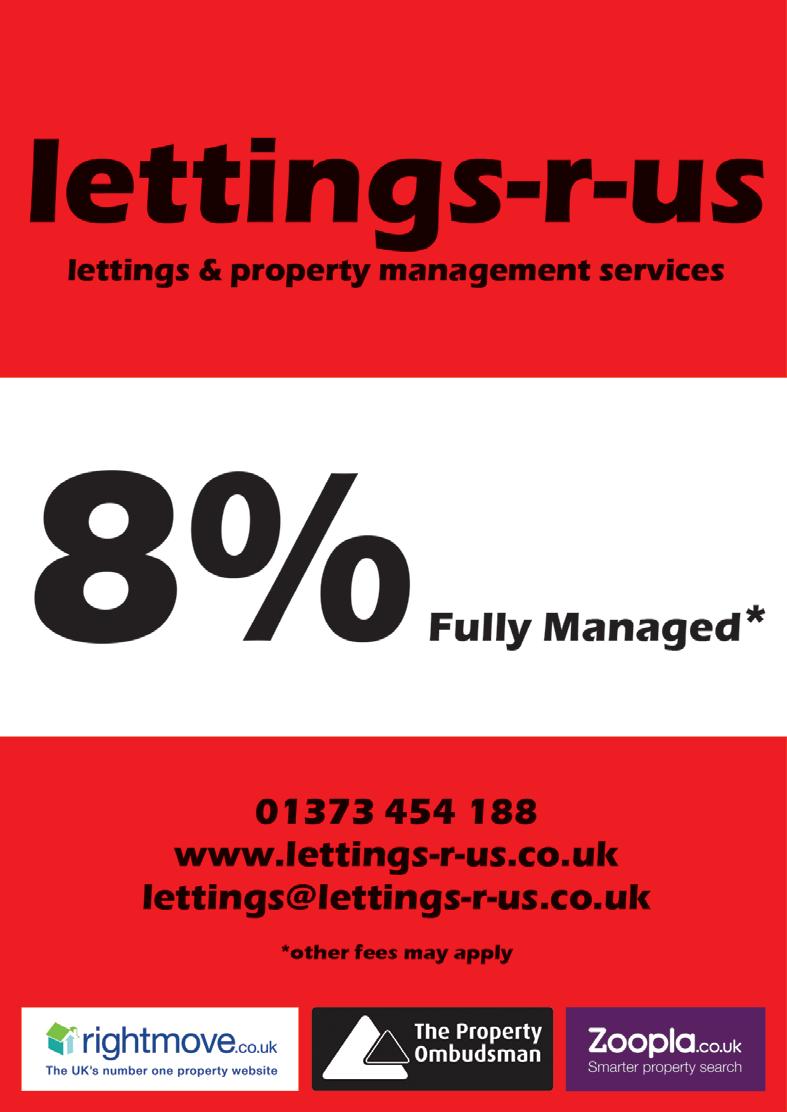 MANAGING DIRECTOR ANDREW FROST Cuckoo Lane Coaching and Consulting Limited We offer you a coaching approach tailored to your needs. We focus on those areas that offer you the best possible coaching experience, and we work with you to achieve your goals, whatever they may be. We work with you one to one, and preferably face to face, in order to consider meaningful, challenging but always helpful questions that will lead to a process of discovery. 07788 140769 www.clcc-ltd.co.uk ANDREW IS A CERTIFIED EXECUTIVE AND LEADERSHIP COACH OFFERING COACHING SERVICES IN BOTH BUSINESS AND PERSONAL AREAS. Working with individuals who by choice or circumstance wish to make changes in their lives. Working with individuals and teams to achieve specific business goals. Working with mid-level executives who aspire to achieve their potential and senior executives who wish to evolve. LIFE COACHING BUSINESS COACHING EXECUTIVE COACHING We help limited companies, sole traders and partnerships. Services include the following: E: accounts@refroudandassociates.co.uk T: (01373) 30 24 68 www.fromeaccountant.co.uk • Bookkeeping • Capital Gains • Cashflow • Company formation • Corporation tax • Monthly accounts • Payroll services • Personal tax returns • VAT returns • Year end accounts Chartered Management Accountant Why choose Lettings-r-us? • Properties let in record time • Competitive fees starting at just 9.6%inc VAT fully managed • List of pre-approved tenants 8 Harris Close, From, BA11 5JY