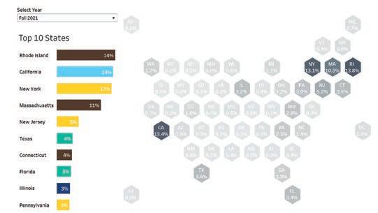 대학교는 78%를 차지한 뉴저지 출신이 가장 많다. Brown 대학 교의 2021년도 신입생 분포에선 로드 아일랜드 출신이 13.8%로 제일 많았다.