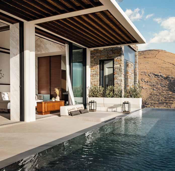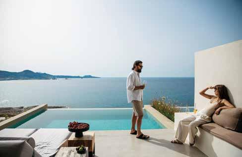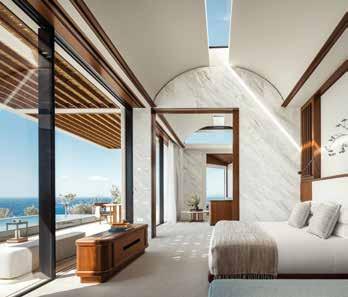 Die insgesamt 63 Villen, die imposant auf einer zerklüfteten Küstenklippe thronen, setzen neue Maßstäbe in Sachen Luxus und Komfort. Raumhohe Fenster und weißer Marmor aus lokalen Steinbrüchen sorgen für helle, lichtdurchflutete Räume. Der Clou: Innen- und Außenbereiche gehen nahtlos ineinander über und fügen sich so in die bezaubernde Landschaft ein. Ein besonderes Highlight ist der private Infinity-Pool sowie eine großzügige Terrasse mit Kamin für magische Stunden unter dem griechischen Sternenhimmel.
