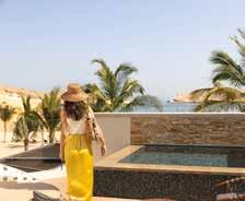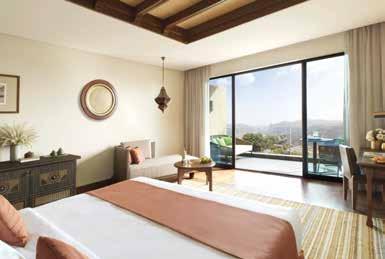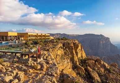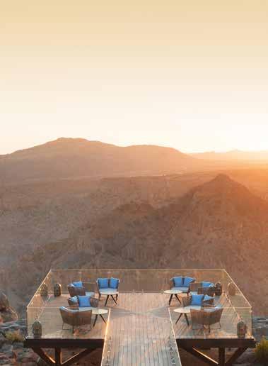tiefe Schluchten und auf dramatische Berglandschaften sind kaum zu toppen. An exklusiven Annehmlichkeiten wird nicht gespart. Für private Momente stehen stilvolle Zimmer mit Balkonen und Villen mit bis zu drei Schlafzimmern, privaten Pools und Butlerservice zur Verfügung. Mediterrane und exotische Küche, Tees, Shisha und weitere kulinarische Freuden bieten die edlen Restaurants und Bars. Ein besonderes Highlight ist das Dinner auf einer Plattform am Rande des Canyons. Ein bisschen schwindelfrei sollte man sein. Und offen für royale Erinnerungen, denn hier ließ sich einst Prinzessin Diana von den spektakulären Panoramablicken begeistern. Wer noch höher hinaus möchte: Im Geländewagen geht’s zum Sonnenuntergangserlebnis auf 2.100 Meter. Wobei es auch auf der Al Baha Terrasse höchst romantisch wird, wenn das Licht in den Feuerschalen flackert und die Sonne hinter den dramatischen Bergen versinkt. Keinesfalls missen sollte man auch das wundervolle Spa, eine Perle der omanischen Architektur. Bei Wellness-Anwendungen, die auf die heilenden Kräfte von Rosenwasser und Granatapfel zurückgreifen, entspannen und sich ein reinigendes und regenerierendes Hammam-Ritual gönnen ist das Höchste der Gefühle.