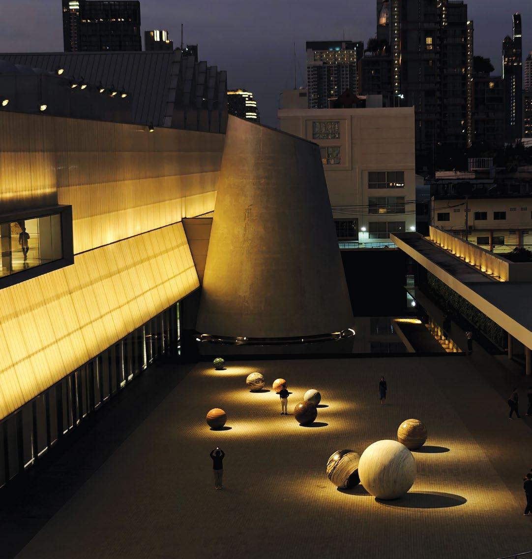 touches over three floors. The museum unfolds vertically, guiding visitors to light-filled galleries, outdoor courtyards and sculpture gardens. Don’t miss the onsite Watthu-Dib Bistro & Bar, a stylish all-day dining venue with a thoughtfully curated menu of Thai and international dishes alongside craft cocktails and wines.