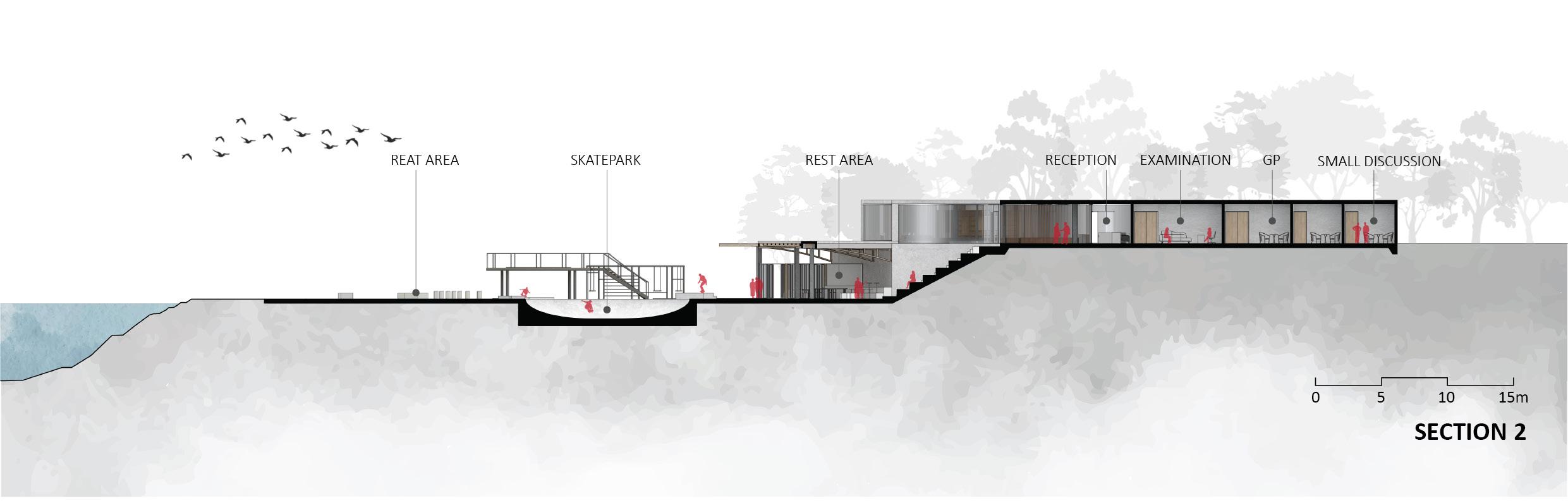 By capitalizing on the varying heights of Callan Point, the building is divided into two levels: the "Headspace" nestled among the trees on the upper level, offering a tranquil sanctuary for individuals seeking mental health support. Adjacent to the road and waterfront, the sports playground is strategically positioned to promote physical activity and outdoor sports. Meanwhile, the activity zone on the lower level, near the main road, serves as a linkage between the headspace and sports court, connected by a semicircular staircase. This area features a platform overlooking the river, serving as a waiting area for patients. The sports court offers three distinct activities: a basketball court along the main road, a skatepark in the center, and a children’s playground with a nearby BBQ area. Overall, this Headspace program provides a relaxed and active atmosphere for people to rejuvenate.