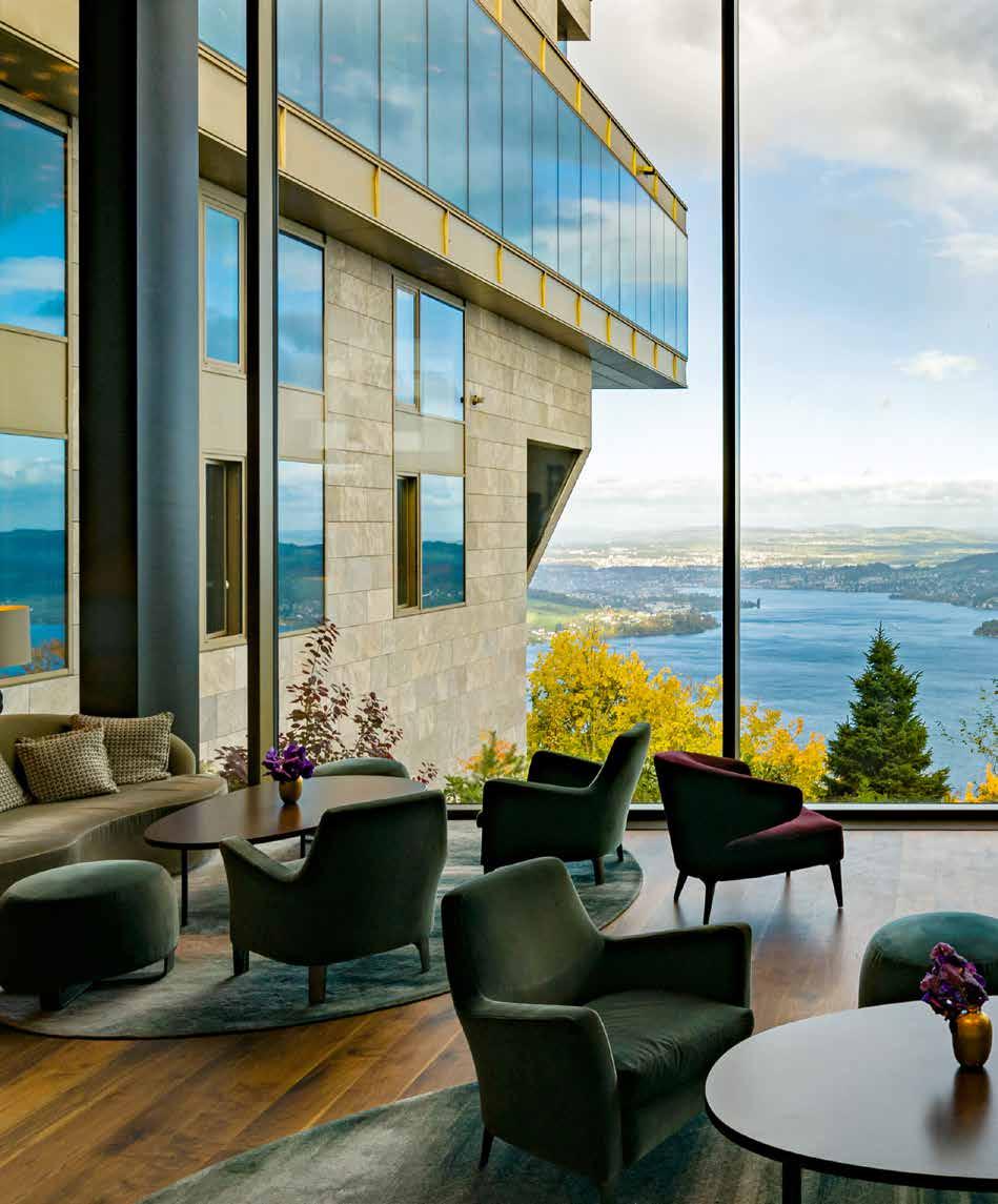 “The Bürgenstock Resort is part of Switzerland and maybe the world’s first hotel chain.” Ironically, Franz Josef Bucher and Josef Durrer didn’t intend to be hoteliers. “The entrepreneurial brothers-in-law opened a hotel as a showroom for their wood floors,” explains Evelyne. Once they recognised the hotel’s business potential, they purchased ‘Alp Tritt’ in 1871, captivated by its magnificent meadows and views above Lake Lucerne. “Photos do not do the location justice,” says Evelyne. “Nothing comes between the sky and the lake here.” Renaming the mountain “Bürgenstock” the duo opened their first hotel two years later, building a road up the steep terrain. This construction feat spawned numerous engineering projects, revolutionising how hoteliers tamed the Swiss Alps. The duo’s hydroelectric plant powered Switzerland’s first electric-powered funicular. The 1905 Hammetschwand Lift, Europe’s highest and fastest outdoor elevator, was inspired by the Eiffel Tower. Rocketing into the sky, “anyone can feel the thrill of adventure,” says Evelyne.