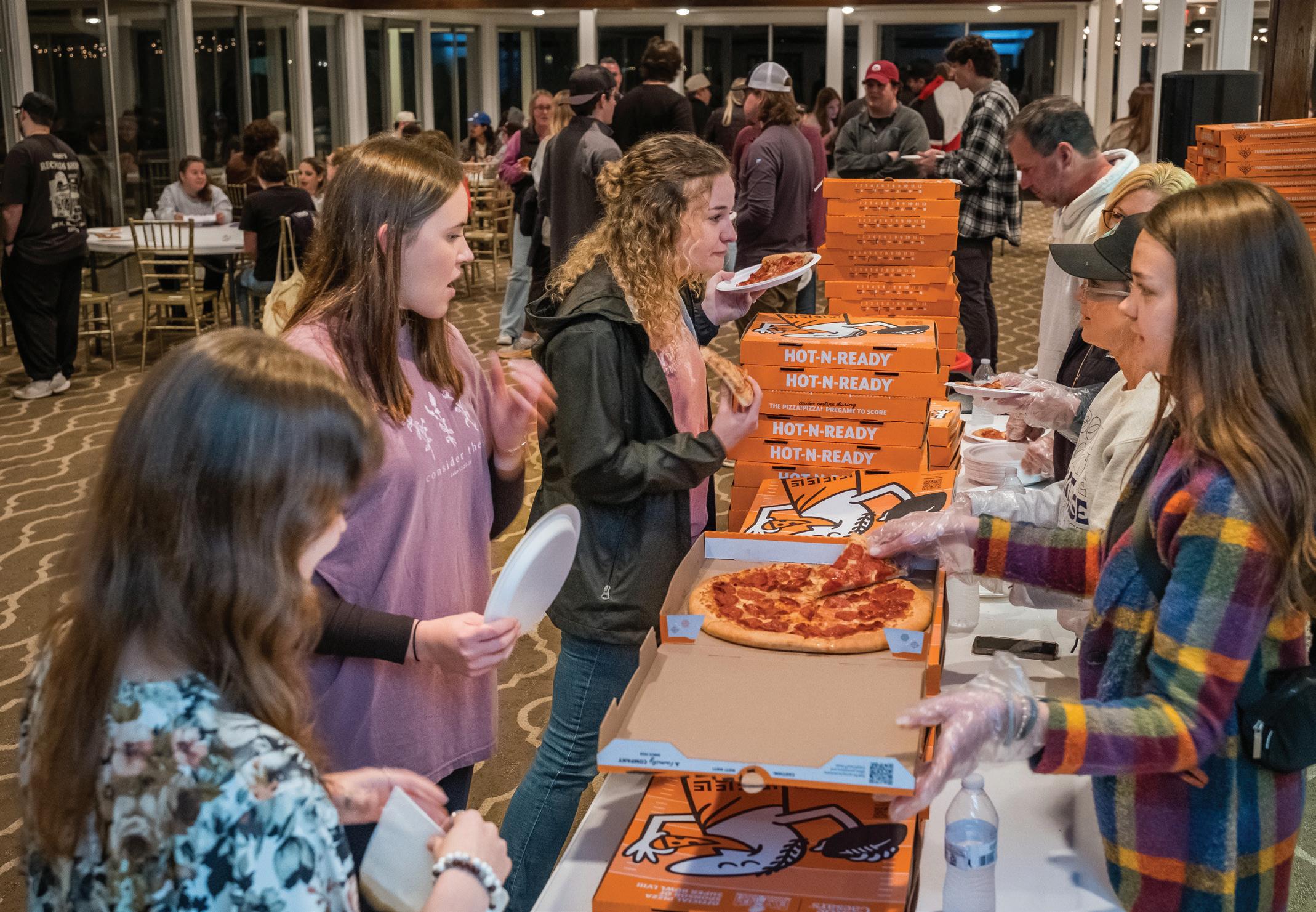 BOATHOUSE MINISTRY GUESTS gather for fellowship and pizza before the evening's worship service.