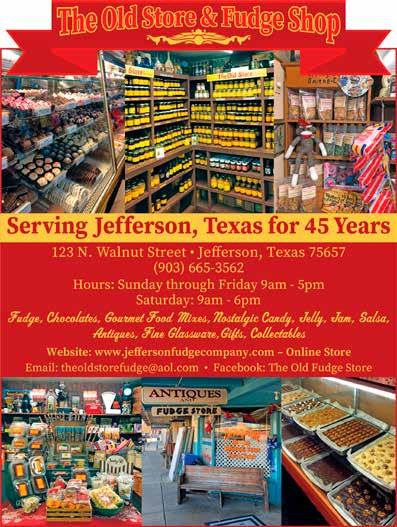 54 | DESTINATION EAST TEXAS 123 N. Walnut Street • Jefferson, Texas 75657 (903) 665-3562 Hours: Sunday through Friday 9am - 5pm Saturday: 9am - 6pm Fudge, Chocolates, Gormet Food Mixes, Nostalgic Candy, Jelly, Jam, Salsa, Antiquies, Fine Glassware, Gifts, Collectables Website: www.jeffersonfudgecompany.com - Online Store Email: theoldstorefudge@aol.com Facebook: The Old Fudge Store Serving Jefferson, Texas for 45 Years The Outpost Expresso Bar Open 7 days a week!! Inside Port Jefferson Outpost 220 N. Polk St., Jefferson, TX | (903) 665-8881 Full-service Expresso Bar with Frappers, Cappuccinos, Lattes, Iced Coffee, Ice Cream Lattees, and Cold Brew Prepared with your choice of milk Port Jefferson Outpost Store Hours: Sunday - Friday 7am-5pm | Satuday 7am-6pm Daily Breakfast 7am-10:45am | Daily Lunch 11am-2pm ptjeffersonoutpost@gmail.com | www.ptjeffersonoutpost.com Gifts • Toys • Kitchenware • Jellies Salsas • Candy • Fudge • Chocolates Blue Bell Ice Cream