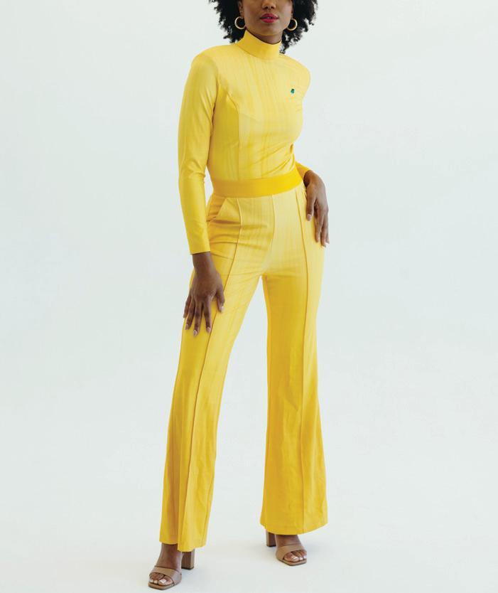 Jumpsuit with a mock neck, shoulder pads, and a cinched waist, and printed yellow tulle design.