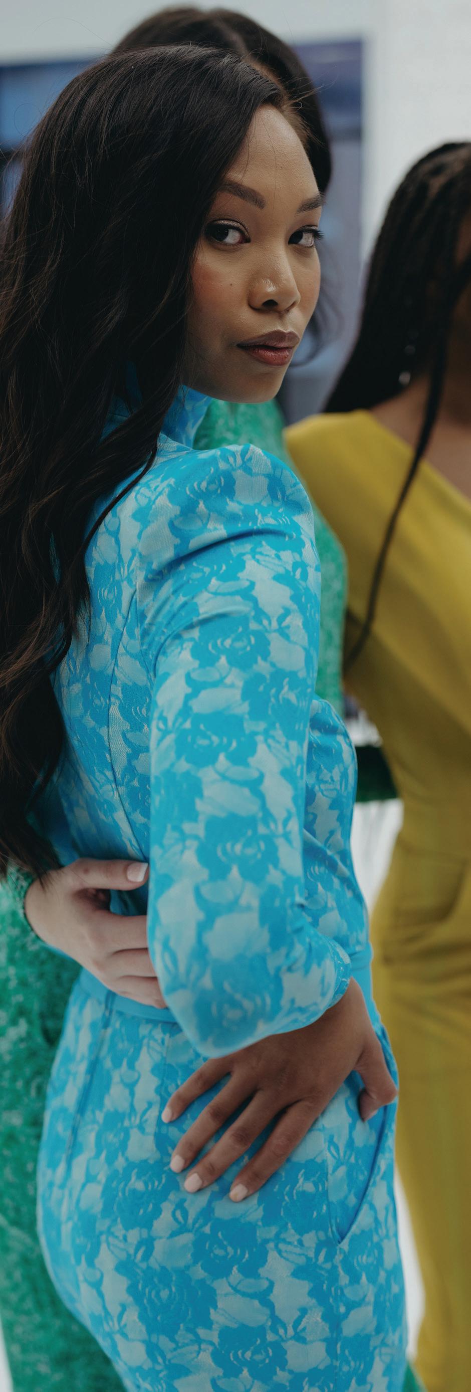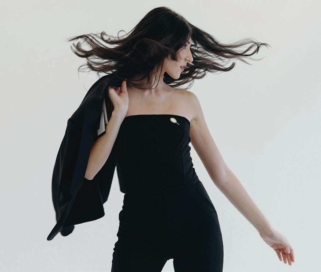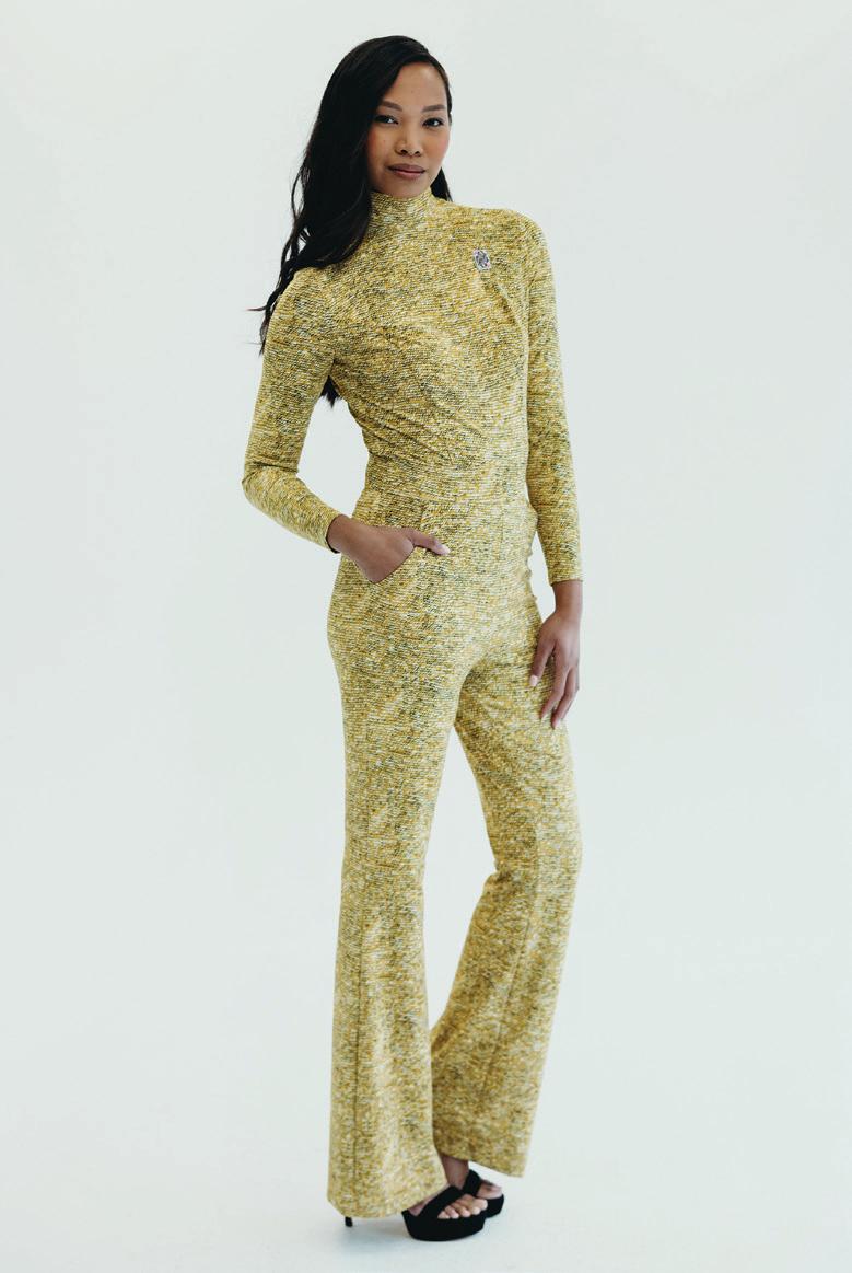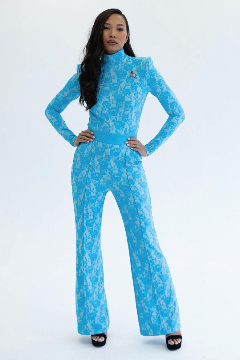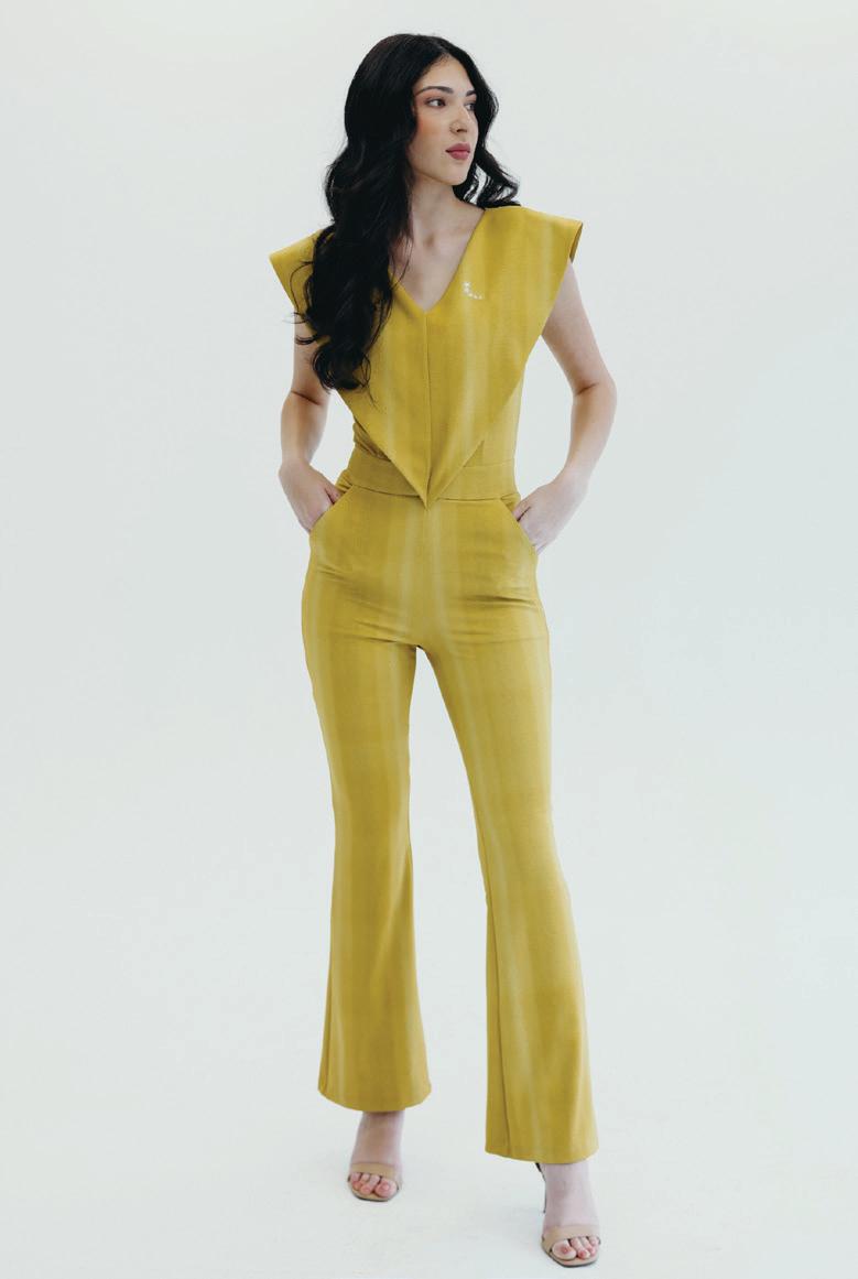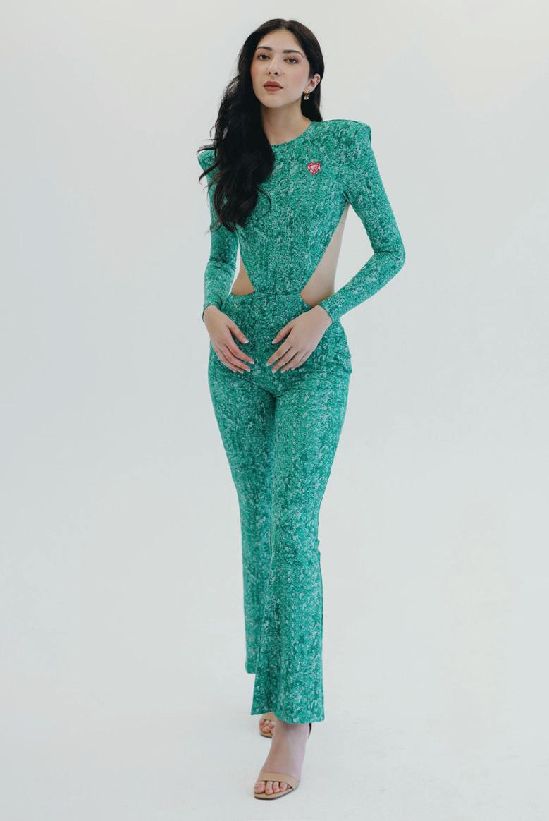 ‘Verde mi Amor’ draws inspiration from the designers’ favorite openbacked holiday garments and her all-time favorite color, green. Printed sequins create the illusion of a draped green sequined gown, featuring an open back, shoulder pads, and wide legs. While sipping your coffee or running errands, one might wonder why you’re not strutting down the runway in this stunning piece.