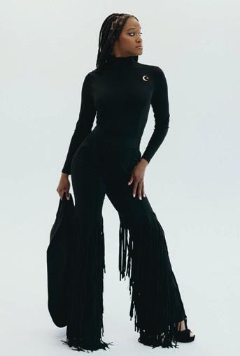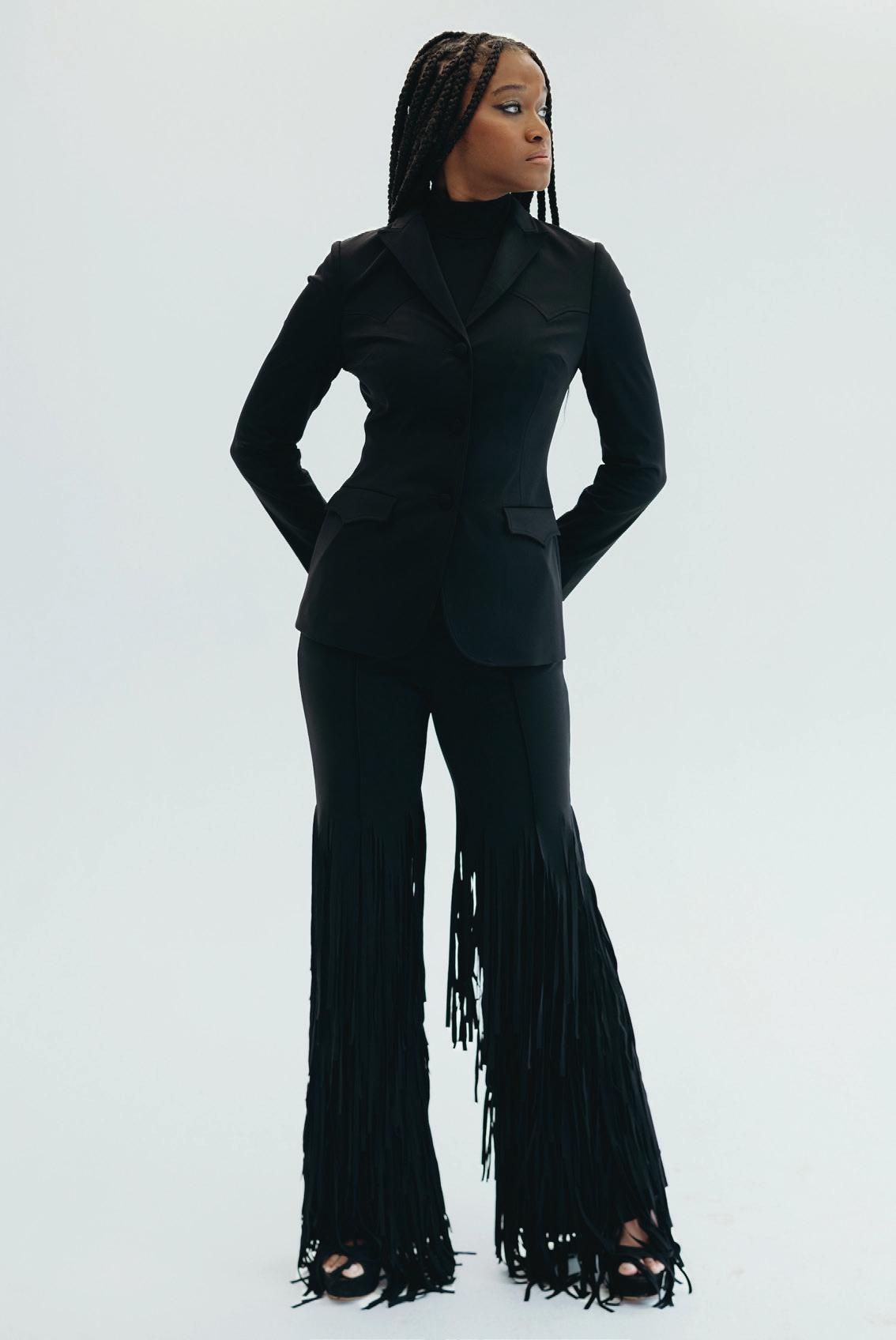 A fitted, mock neck, sleek jumpsuit with hand-cut black fringe.