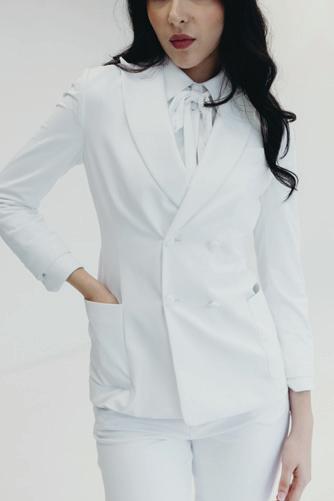 ‘Meet Me At Noon’ presents a Nylon and Spandex suit, designed to provide a comfortable and sleek corporate look. With this suit, you can work in style with the comfort of your favorite leggings, while still being able to express your feminine allure. This all white ensemble features high waisted pants, a buttoned blouse with a neck bow, and an oversized blazer. Perhaps wearing this suit will attract someone to meet you at noon.